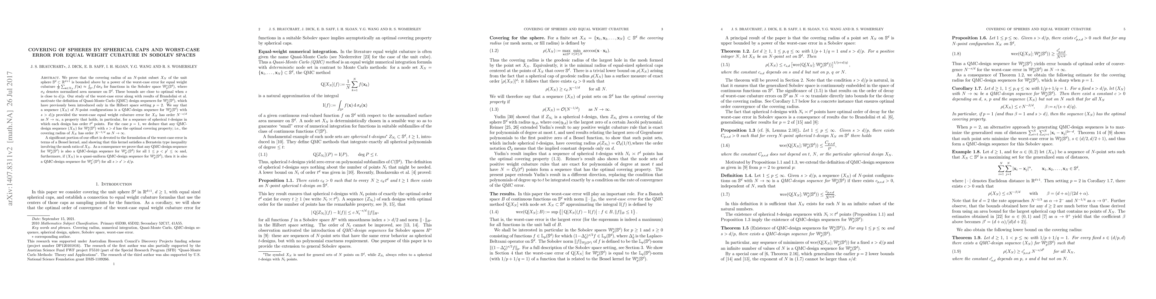 We prove that the covering radius of an $N$-point subset $X_N$ of the unit sphere $S^d \subset R^{d+1}$ is bounded above by a power of the worst-case error for equal weight cubature $\frac{1}{N}\sum_{\mathbf{x} \in X_N}f(\mathbf{x}) \approx \int_{S^d} f \, \mathrm{d} \sigma_d$ for functions in the Sobolev space $\mathbb{W}_p^s(S^d)$, where $\sigma_d$ denotes normalized area measure on $S^d.$ These bounds are close to optimal when $s$ is close to $d/p$. Our study of the worst-case error along with results of Brandolini et al. motivate the definition of Quasi-Monte Carlo (QMC) design sequences for $\mathbb{W}_p^s(S^d)$, which have previously been introduced only in the Hilbert space setting $p=2$. We say that a sequence $(X_N)$ of $N$-point configurations is a QMC-design sequence for $\mathbb{W}_p^s(S^d)$ with $s > d/p$ provided the worst-case equal weight cubature error for $X_N$ has order $N^{-s/d}$ as $N \to \infty$, a property that holds, in particular, for a sequence of spherical $t$-designs in which each design has order $t^d$ points. For the case $p = 1$, we deduce that any QMC-design sequence $(X_N)$ for $\mathbb{W}_1^s(S^d)$ with $s > d$ has the optimal covering property; i.e., the covering radius of $X_N$ has order $N^{-1/d}$ as $N \to \infty$. A significant portion of our effort is devoted to the formulation of the worst-case error in terms of a Bessel kernel, and showing that this kernel satisfies a Bernstein type inequality involving the mesh ratio of $X_N$. As a consequence we prove that any QMC-design sequence for $\mathbb{W}_p^s(S^d)$ is also a QMC-design sequence for $\mathbb{W}_{p^\prime}^s(S^d)$ for all $1 \leq p < p^\prime \leq \infty$ and, furthermore, if $(X_N)$ is a quasi-uniform QMC-design sequence for $\mathbb{W}_p^s(S^d)$, then it is also a QMC-design sequence for $\mathbb{W}_p^{s^\prime}(S^d)$ for all $s > s^\prime > d/p$.