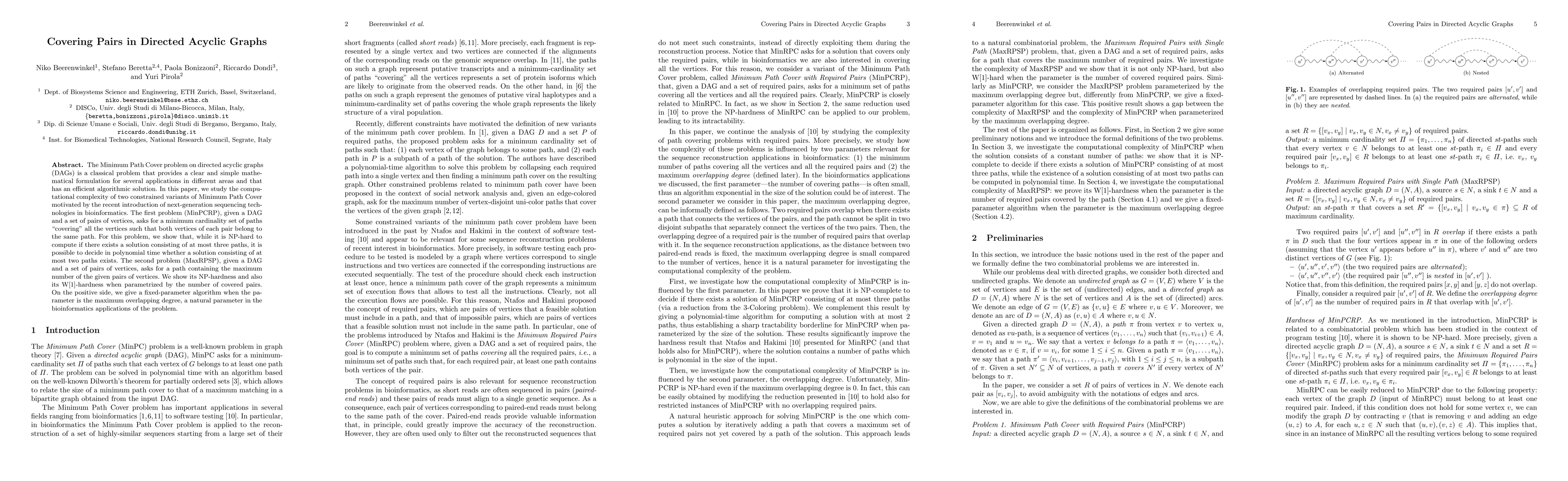 This paper explores two constrained variants of the Minimum Path Cover problem in directed acyclic graphs (DAGs), motivated by bioinformatics applications. It proves MinPCRP is NP-hard for three paths but solvable in polynomial time for two paths. MaxRPSP is shown to be NP-hard and W[1]-hard when parameterized by covered pairs, but it has a fixed-parameter algorithm based on maximum overlapping degree.