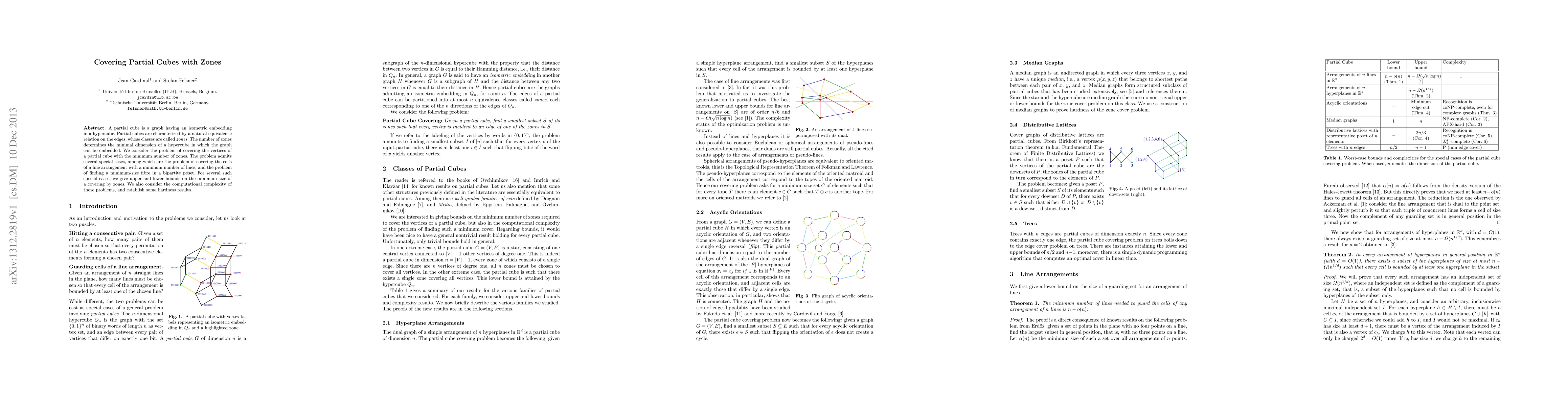 A partial cube is a graph having an isometric embedding in a hypercube. Partial cubes are characterized by a natural equivalence relation on the edges, whose classes are called zones. The number of zones determines the minimal dimension of a hypercube in which the graph can be embedded. We consider the problem of covering the vertices of a partial cube with the minimum number of zones. The problem admits several special cases, among which are the problem of covering the cells of a line arrangement with a minimum number of lines, and the problem of finding a minimum-size fibre in a bipartite poset. For several such special cases, we give upper and lower bounds on the minimum size of a covering by zones. We also consider the computational complexity of those problems, and establish some hardness results.