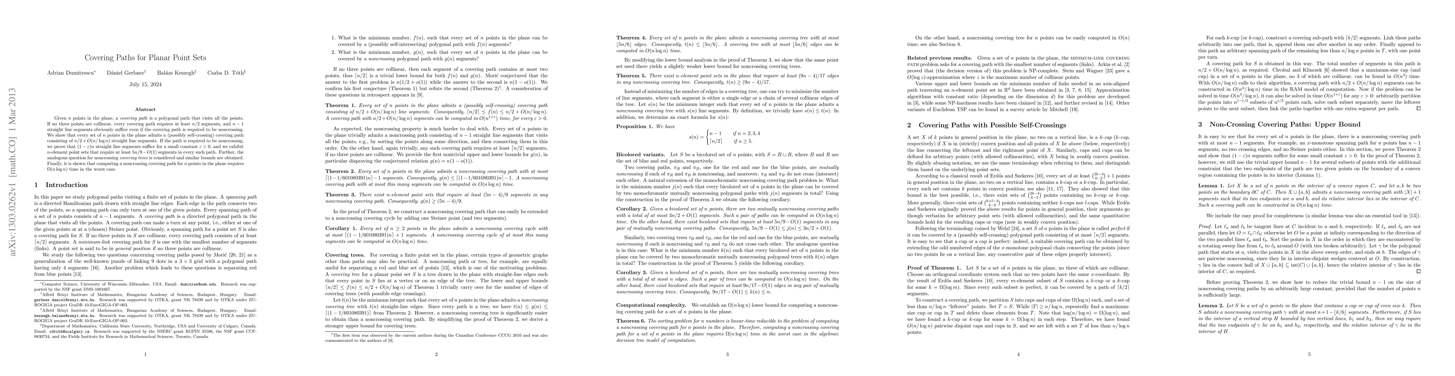Given $n$ points in the plane, a \emph{covering path} is a polygonal path that visits all the points. If no three points are collinear, every covering path requires at least $n/2$ segments, and $n-1$ straight line segments obviously suffice even if the covering path is required to be noncrossing. We show that every set of $n$ points in the plane admits a (possibly self-crossi ng) covering path consisting of $n/2 +O(n/\log{n})$ straight line segments. If the path is required to be noncrossing, we prove that $(1-\eps)n$ straight line segments suffice for a small constant $\eps>0$, and we exhibit $n$-element point sets that require at least $5n/9 -O(1)$ segments in every such path. Further, the analogous question for noncrossing \emph{covering trees} is considered and similar bounds are obtained. Finally, it is shown that computing a noncrossing covering path for $n$ points in the plane requires $\Omega(n \log{n})$ time in the worst case.