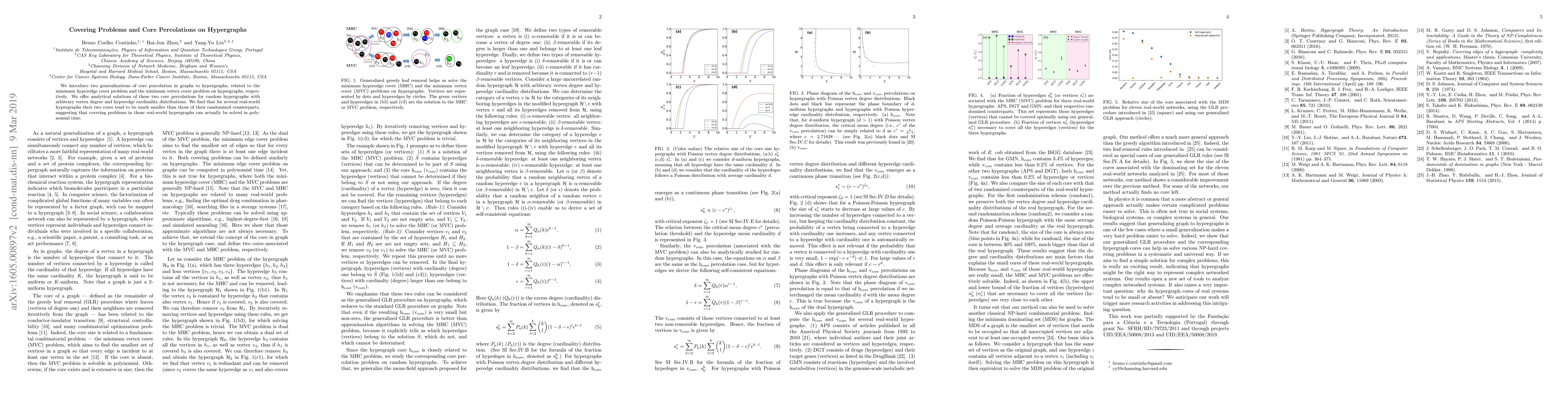 Covering problems are classical computational problems concerning whether a certain combinatorial structure 'covers' another. For example, the minimum vertex covering problem aims to find the smallest set of vertices in a graph so that each edge is incident to at least one vertex in that set. Interestingly, the computational complexity of the minimum vertex covering problem in graphs is closely related to the core percolation problem, where the core is a special subgraph obtained by the greedy leaf removal procedure. Here, by generalizing the greedy leaf removal procedure in graphs to hypergraphs, we introduce two generalizations of core percolation in graphs to hypergraphs, related to the minimum hyperedge cover problem and the minimum vertex cover problem on hypergraphs, respectively. We offer analytical solutions of these two core percolations for random hypergraphs with arbitrary vertex degree and hyperedge cardinality distributions. We also compute these two cores in several real-world hypergraphs, finding that they tend to be much smaller than their randomized counterparts. This result suggests that both the minimum hyperedge cover problem and the minimum vertex cover problem in those real-world hypergraphs can actually be solved in polynomial time. Finally, we map the minimum dominating set problem in graphs to the minimum hyperedge cover problem in hypergraphs. We show that our generalized greedy leaf removel procedure significantly outperforms the state-of-the-art method in solving the minimum dominating set problem.
