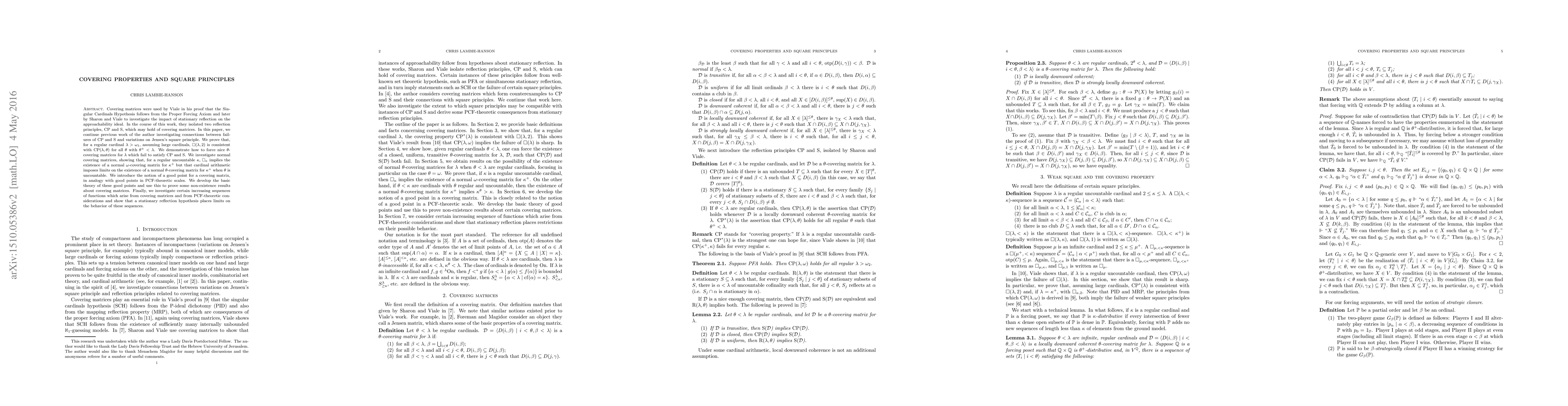 This paper explores the connections between covering matrices and square principles in set theory, proving that $\square(\lambda, 2)$ is consistent with $\mathrm{CP}(\lambda, \theta)$ under large cardinal assumptions. It also investigates normal covering matrices and their implications on cardinal arithmetic and the behavior of sequences derived from covering matrices.