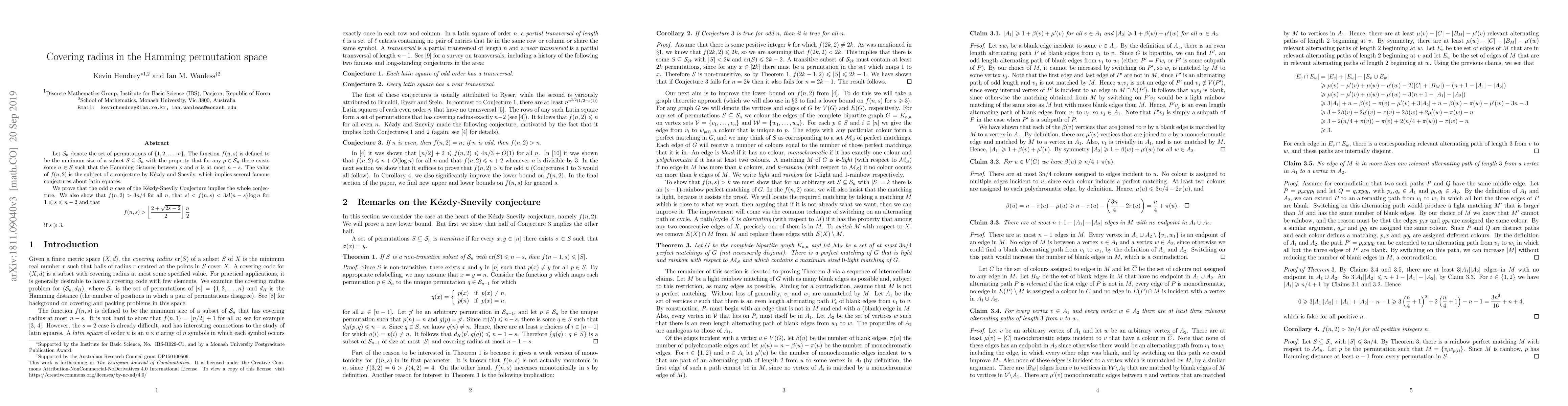This paper proves a conjecture about the minimum size of subsets in permutation spaces that cover specific Hamming distances, with implications for latin squares.