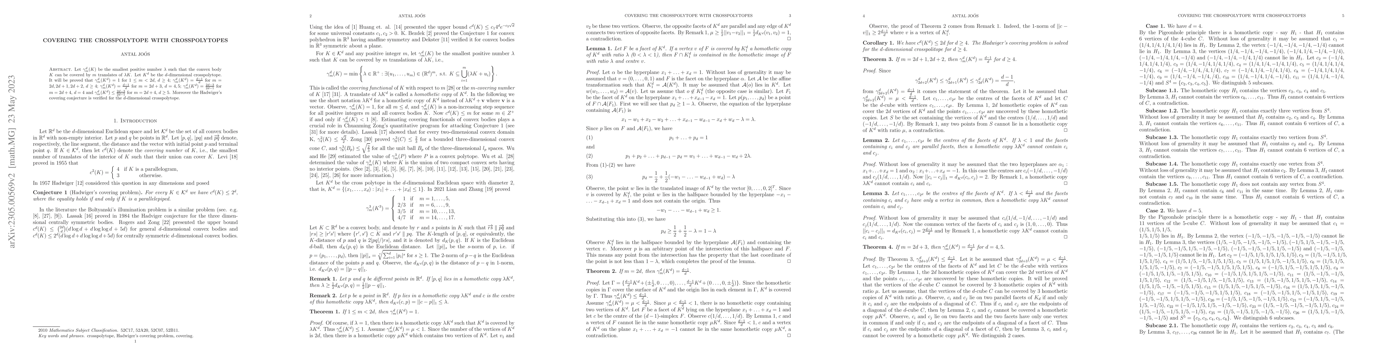 Let $\gamma^d_m(K)$ be the smallest positive number $\lambda$ such that the convex body $K$ can be covered by $m$ translates of $\lambda K$. Let $K^d$ be the $d$-dimensional crosspolytope. It will be proved that $\gamma^d_m(K^d)=1$ for $1\le m< 2d$, $d\ge4$; $\gamma^d_m(K^d)=\frac{d-1}{d}$ for $m=2d,2d+1,2d+2$, $d\ge4$; $\gamma^d_m(K^d)=\frac{d-1}{d}$ for $ m= 2d+3$, $d=4,5$; $\gamma^d_m(K^d)=\frac{2d-3}{2d-1}$ for $ m= 2d+4$, $d=4$ and $\gamma^d_m(K^d)\le\frac{2d-3}{2d-1}$ for $ m= 2d+4$, $d\ge5$. Moreover the Hadwiger's covering conjecture is verified for the $d$-dimensional crosspolytope.