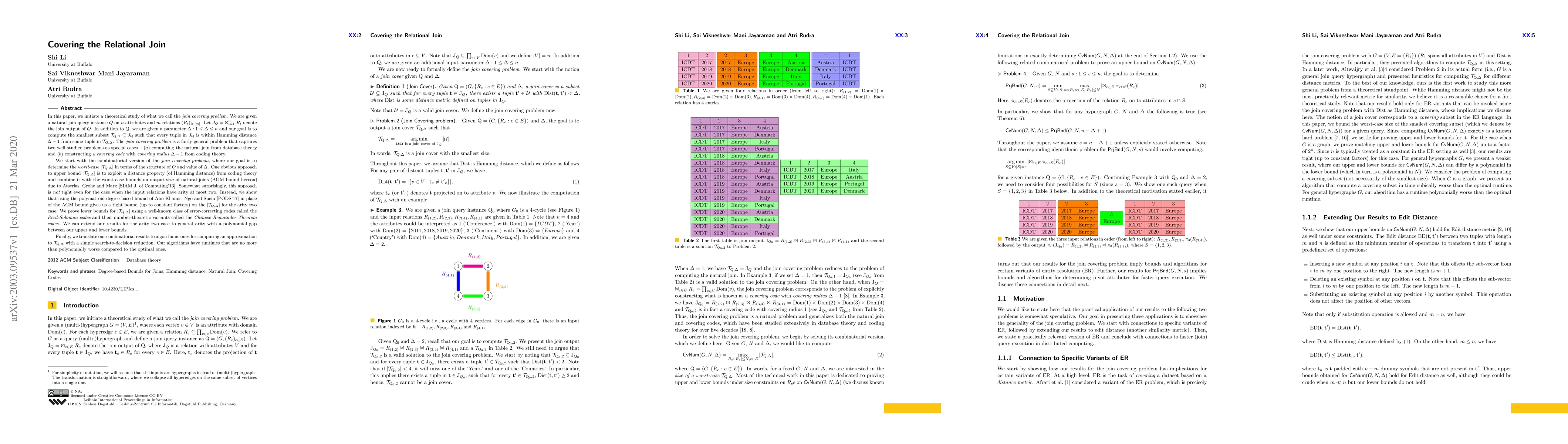In this paper, we initiate a theoretical study of what we call the join covering problem. We are given a natural join query instance $Q$ on $n$ attributes and $m$ relations $(R_i)_{i \in [m]}$. Let $J_{Q} = \ \Join_{i=1}^m R_i$ denote the join output of $Q$. In addition to $Q$, we are given a parameter $\Delta: 1\le \Delta\le n$ and our goal is to compute the smallest subset $\mathcal{T}_{Q, \Delta} \subseteq J_{Q}$ such that every tuple in $J_{Q}$ is within Hamming distance $\Delta - 1$ from some tuple in $\mathcal{T}_{Q, \Delta}$. The join covering problem captures both computing the natural join from database theory and constructing a covering code with covering radius $\Delta - 1$ from coding theory, as special cases. We consider the combinatorial version of the join covering problem, where our goal is to determine the worst-case $|\mathcal{T}_{Q, \Delta}|$ in terms of the structure of $Q$ and value of $\Delta$. One obvious approach to upper bound $|\mathcal{T}_{Q, \Delta}|$ is to exploit a distance property (of Hamming distance) from coding theory and combine it with the worst-case bounds on output size of natural joins (AGM bound hereon) due to Atserias, Grohe and Marx [SIAM J. of Computing'13]. Somewhat surprisingly, this approach is not tight even for the case when the input relations have arity at most two. Instead, we show that using the polymatroid degree-based bound of Abo Khamis, Ngo and Suciu [PODS'17] in place of the AGM bound gives us a tight bound (up to constant factors) on the $|\mathcal{T}_{Q, \Delta}|$ for the arity two case. We prove lower bounds for $|\mathcal{T}_{Q, \Delta}|$ using well-known classes of error-correcting codes e.g, Reed-Solomon codes. We can extend our results for the arity two case to general arity with a polynomial gap between our upper and lower bounds.