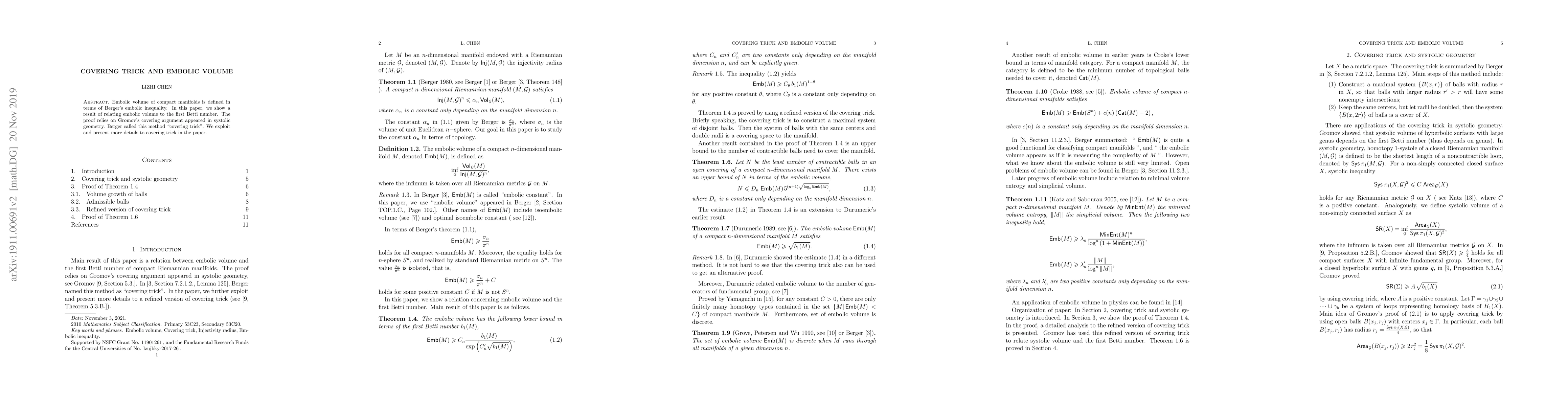 Embolic volume of compact manifolds is defined in terms of Berger's embolic inequality. In this paper, we show a result of relating embolic volume to the first Betti number. The proof relies on Gromov's covering argument appeared in systolic geometry. Berger called this method covering trick. We exploit and present more details to covering trick in the paper.