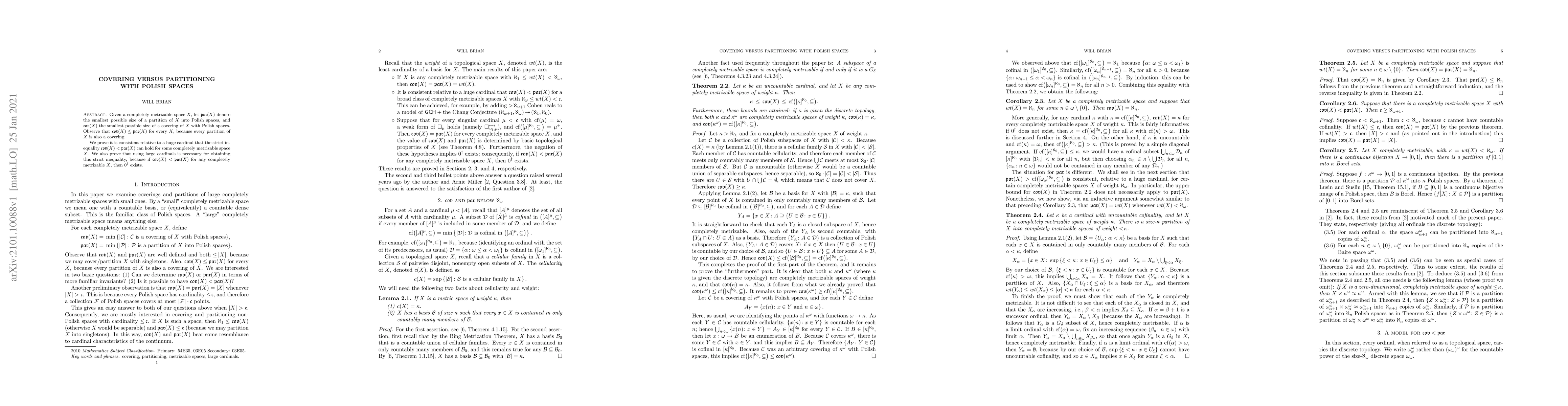 Researchers prove that there exists a completely metrizable space where covering with Polish spaces requires fewer sets than partitioning, requiring large cardinals to achieve this strict inequality.