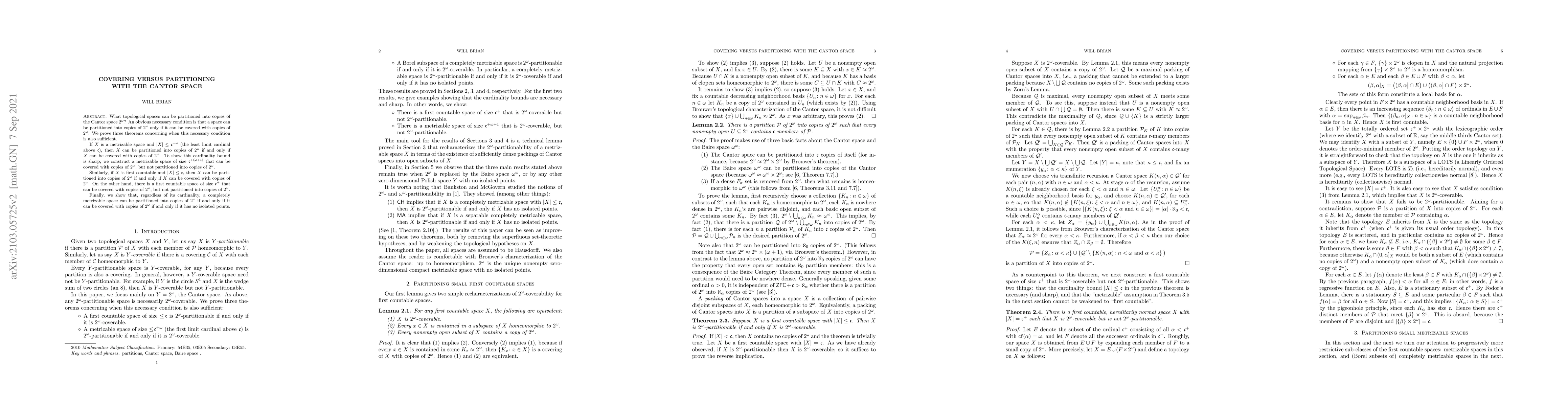 What topological spaces can be partitioned into copies of the Cantor space $2^\omega$? An obvious necessary condition is that a space can be partitioned into copies of $2^\omega$ only if it can be covered with copies of $2^\omega$. We prove three theorems concerning when this necessary condition is also sufficient. If $X$ is a metrizable space and $|X| \leq \mathfrak{c}^{+\omega}$ (the least limit cardinal $>\!\mathfrak{c}$), then $X$ can be partitioned into copies of $2^\omega$ if and only if $X$ can be covered with copies of $2^\omega$. To show this cardinality bound is sharp, we construct a metrizable space of size $\mathfrak{c}^{+(\omega+1)}$ that can be covered with copies of $2^\omega$, but not partitioned into copies of $2^\omega$. Similarly, if $X$ is first countable and $|X| \leq \mathfrak{c}$, then $X$ can be partitioned into copies of $2^\omega$ if and only if $X$ can be covered with copies of $2^\omega$. On the other hand, there is a first countable space of size $\mathfrak{c}^+$ that can be covered with copies of $2^\omega$, but not partitioned into copies of $2^\omega$. Finally, we show that a completely metrizable space can be partitioned into copies of $2^\omega$ if and only if it can be covered with copies of $2^\omega$ if and only if it has no isolated points.