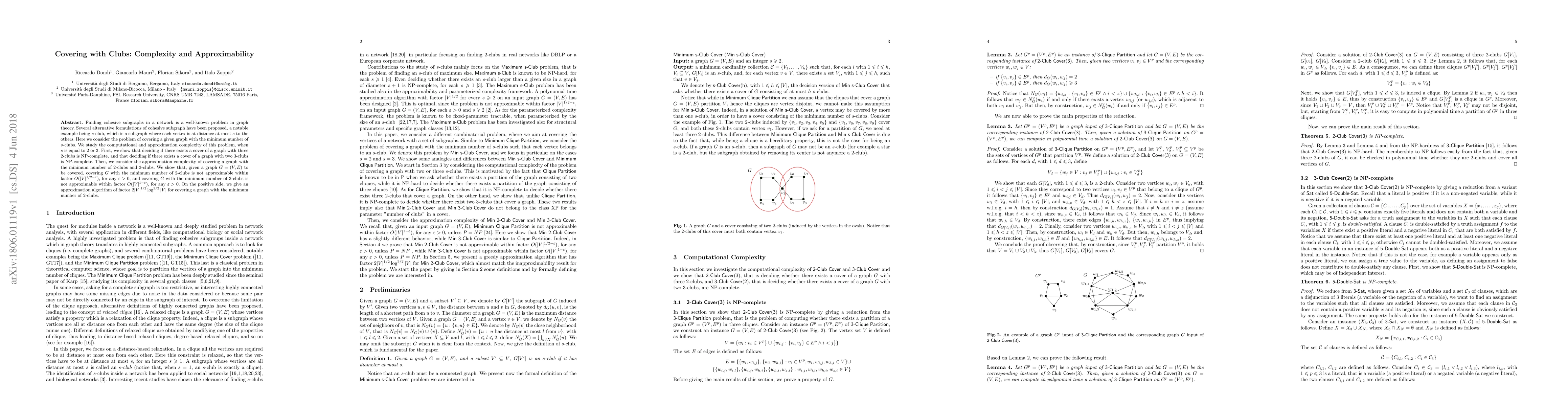 This paper investigates the computational and approximation complexity of covering a graph with the minimum number of $s$-clubs, where each vertex is at most distance $s$ from others. It proves NP-completeness for $s=2$ and $s=3$ and shows that covering with $2$-clubs and $3$-clubs is not approximable within certain factors. However, an approximation algorithm with a factor of $2|V|^{1/2}\log^{3/2} |V|$ is provided for $2$-clubs.