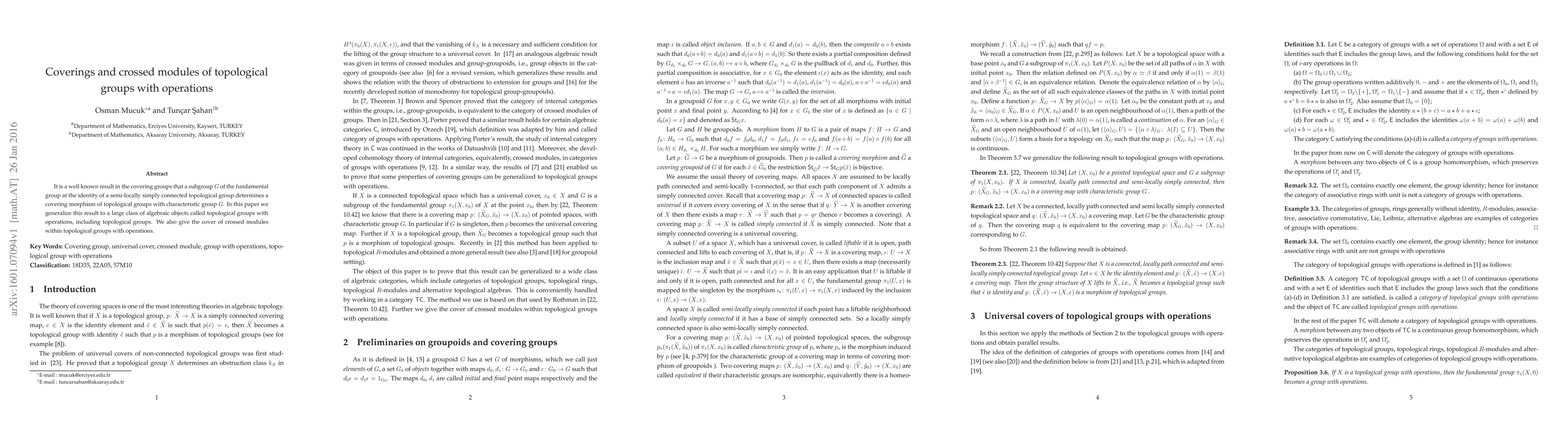 This paper generalizes the concept of covering groups to topological groups with operations, demonstrating that a subgroup of the fundamental group determines a covering morphism, and extends this result to crossed modules within these structures.