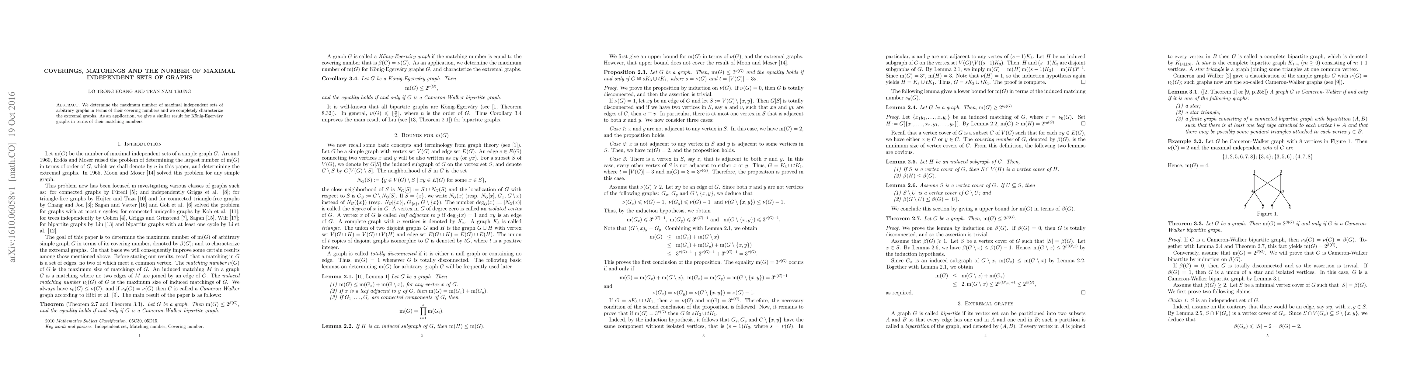 Summary: The paper determines the maximum number of maximal independent sets in arbitrary graphs using covering numbers and identifies extremal graphs. It also extends this result to Kőnig-Egerváry graphs based on matching numbers.