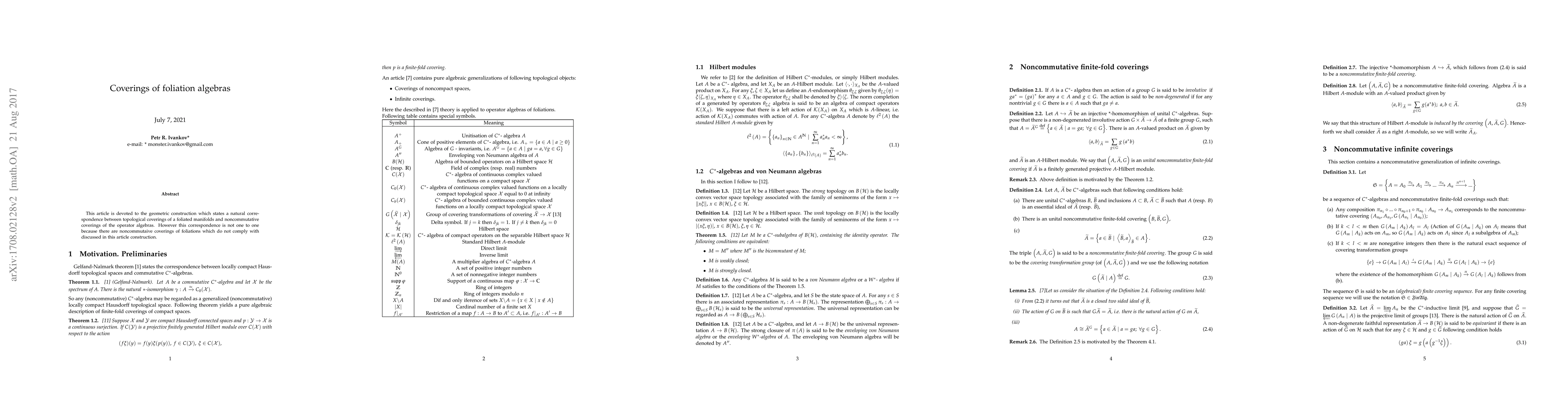 This paper explores the geometric link between topological coverings of foliated manifolds and noncommutative coverings of operator algebras, noting that while a correspondence exists, it is not one-to-one due to noncommutative coverings that do not fit the proposed construction.