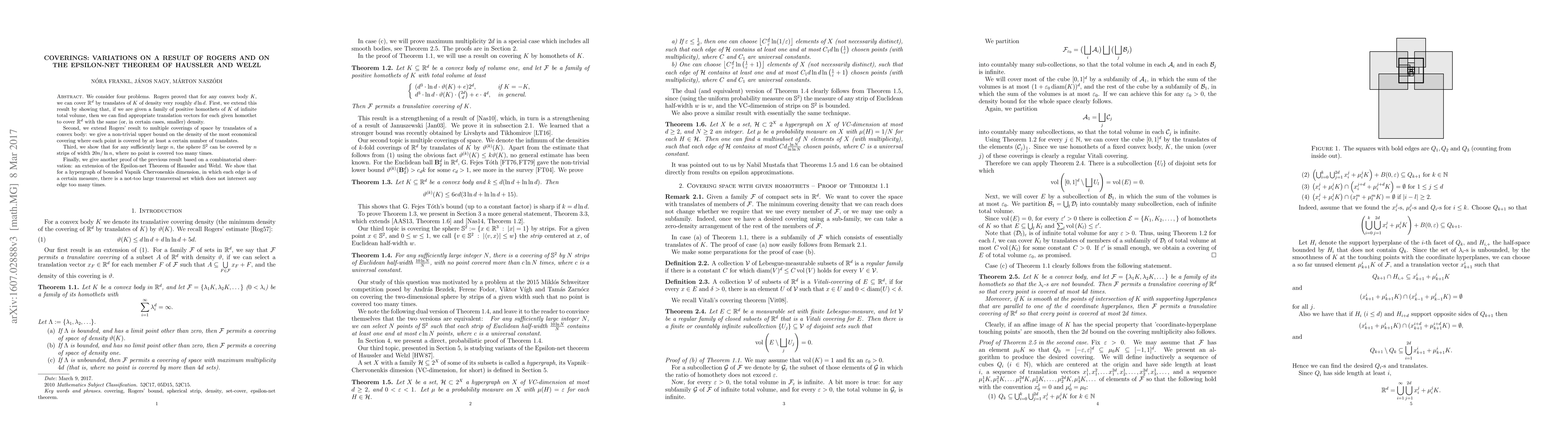 We consider four problems. Rogers proved that for any convex body $K$, we can cover ${\mathbb R}^d$ by translates of $K$ of density very roughly $d\ln d$. First, we extend this result by showing that, if we are given a family of positive homothets of $K$ of infinite total volume, then we can find appropriate translation vectors for each given homothet to cover ${\mathbb R}^d$ with the same (or, in certain cases, smaller) density. Second, we extend Rogers' result to multiple coverings of space by translates of a convex body: we give a non-trivial upper bound on the density of the most economical covering where each point is covered by at least a certain number of translates. Third, we show that for any sufficiently large $n$, the sphere ${\mathbb S}^2$ can be covered by $n$ strips of width $20n/\ln n$, where no point is covered too many times. Finally, we give another proof of the previous result based on a combinatorial observation: an extension of the Epsilon-net Theorem of Haussler and Welzl. We show that for a hypergraph of bounded Vapnik--Chervonenkis dimension, in which each edge is of a certain measure, there is a not-too large transversal set which does not intersect any edge too many times.