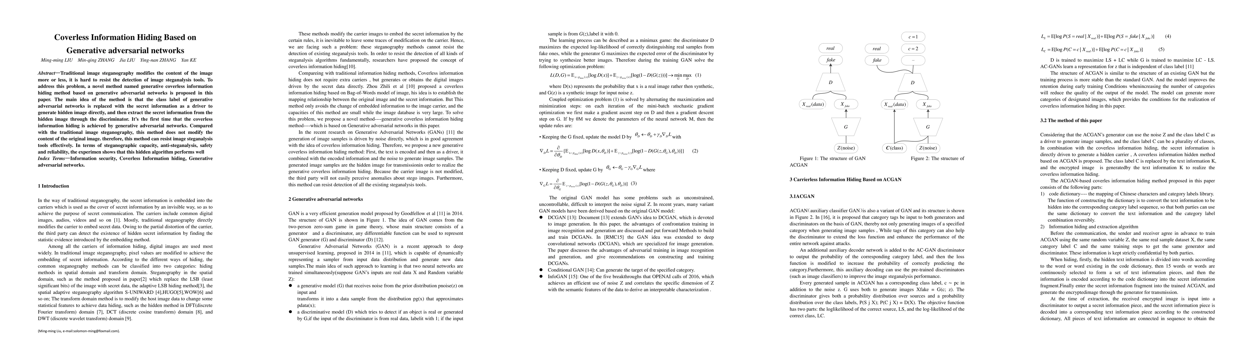 This paper proposes a novel coverless information hiding method using generative adversarial networks (GANs) that replaces the class label of GANs with secret information to generate hidden images without altering the original image content. This approach effectively resists detection by steganalysis tools and demonstrates good performance in terms of capacity, anti-steganalysis, safety, and reliability.