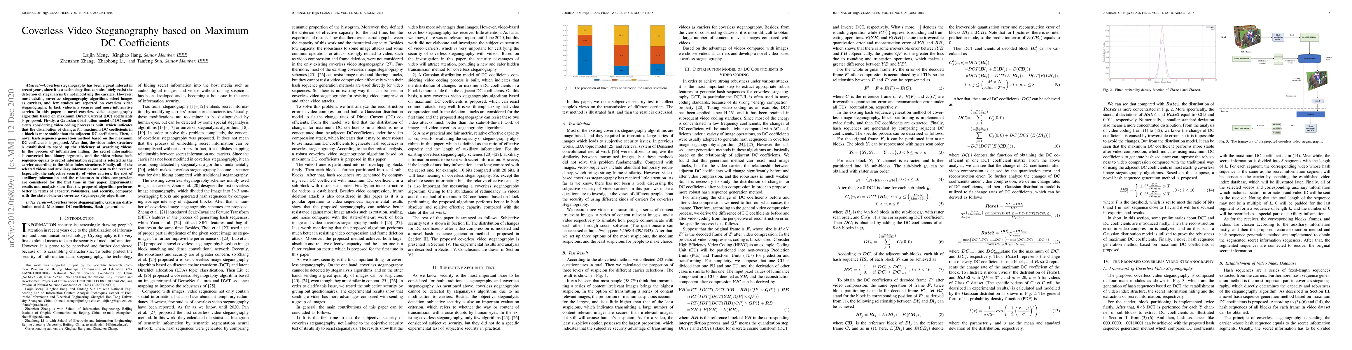 This paper proposes a novel coverless video steganography method based on maximum DC coefficients, leveraging stable Gaussian distribution models of DC coefficients in video coding. The method selects videos based on hash sequences derived from these coefficients, ensuring high capacity, robustness, and security while considering subjective video carrier security, auxiliary information cost, and compression resilience.