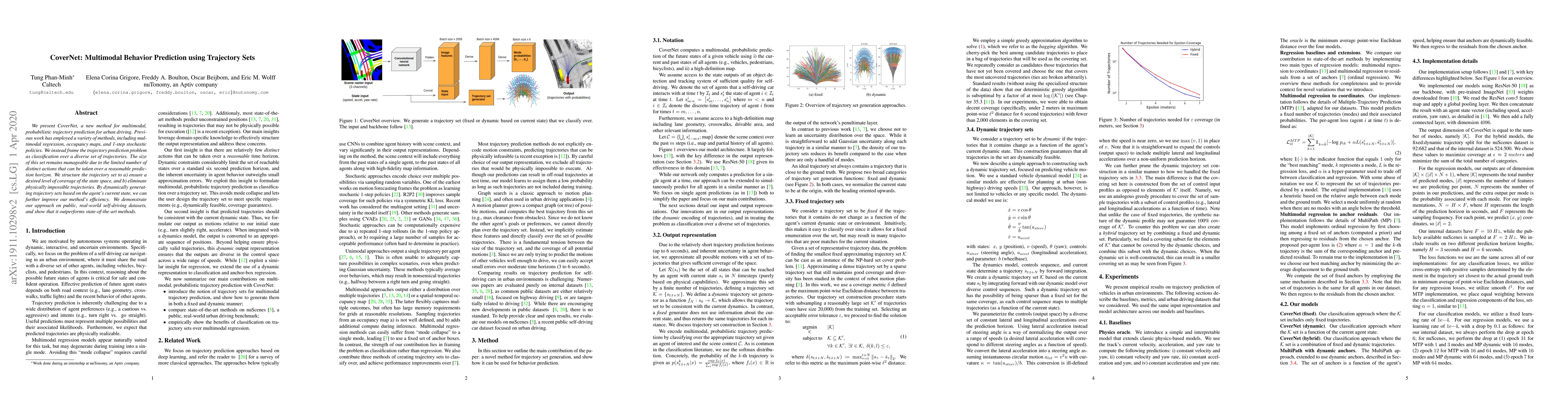 CoverNet is a novel method for multimodal, probabilistic trajectory prediction in urban driving, framing the problem as classification over manageable sets of feasible trajectories. It outperforms existing methods by dynamically generating trajectory sets based on the agent's current state, ensuring coverage and excluding impossible paths.