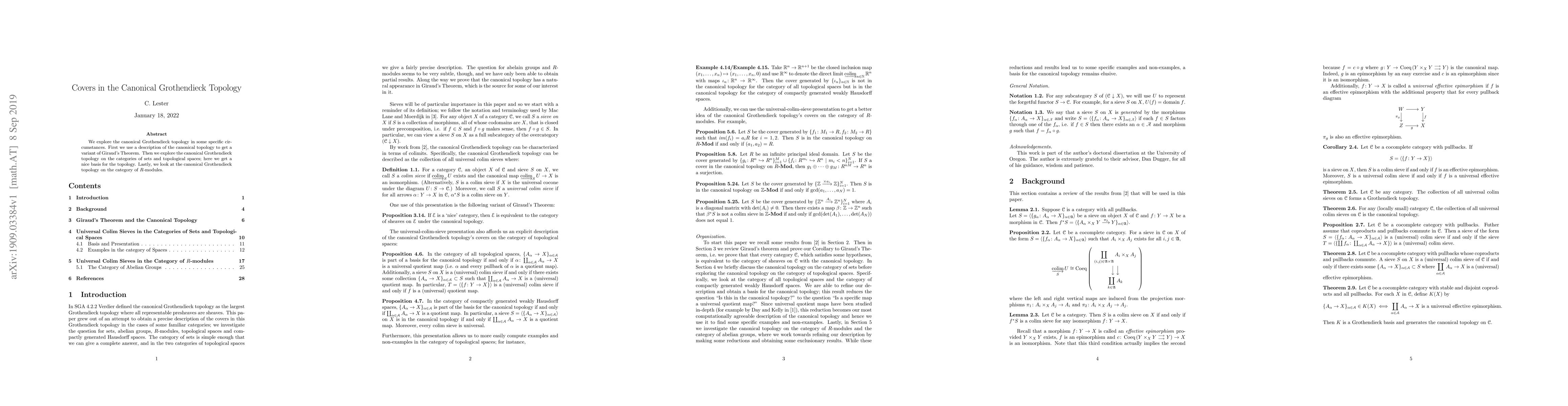 We explore the canonical Grothendieck topology in some specific circumstances. First we use a description of the canonical topology to get a variant of Giraud's Theorem. Then we explore the canonical Grothendieck topology on the categories of sets and topological spaces; here we get a nice basis for the topology. Lastly, we look at the canonical Grothendieck topology on the category of $R$-modules.