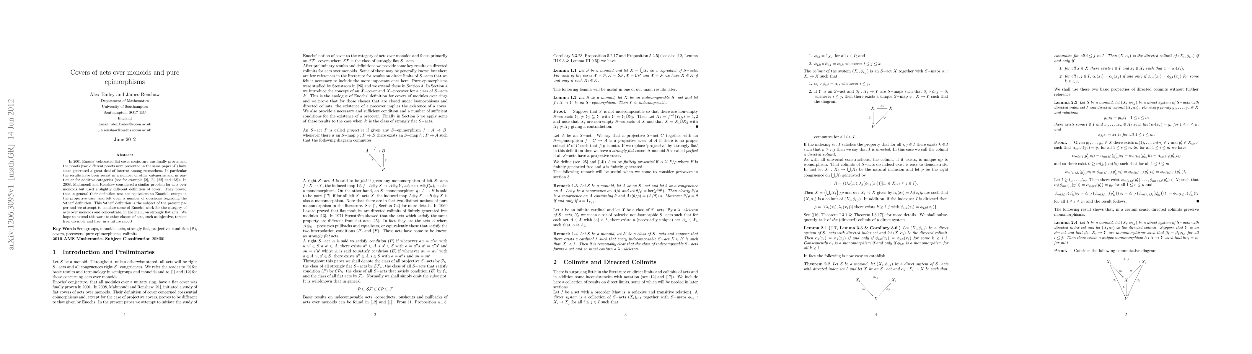 In 2001 Enoch's celebrated flat cover conjecture was finally proven and the proofs (two different proofs were presented in the same paper [4]) have since generated a great deal of interest among researchers. In particular the results have been recast in a number of other categories and in particular for additive categories (see for example [2], [3], [22] and [23]). In 2008, Mahmoudi and Renshaw considered a similar problem for acts over monoids but used a slightly different definition of cover. They proved that in general their definition was not equivalent to Enoch's, except in the projective case, and left open a number of questions regarding the `other' definition. This `other' definition is the subject of the present paper and we attempt to emulate some of Enoch's work to the category of acts over monoids and concentrate in the main on strongly flat acts. We hope to extend this work to other classes of acts, such as injective, torsion free, divisible and free, in a future report.