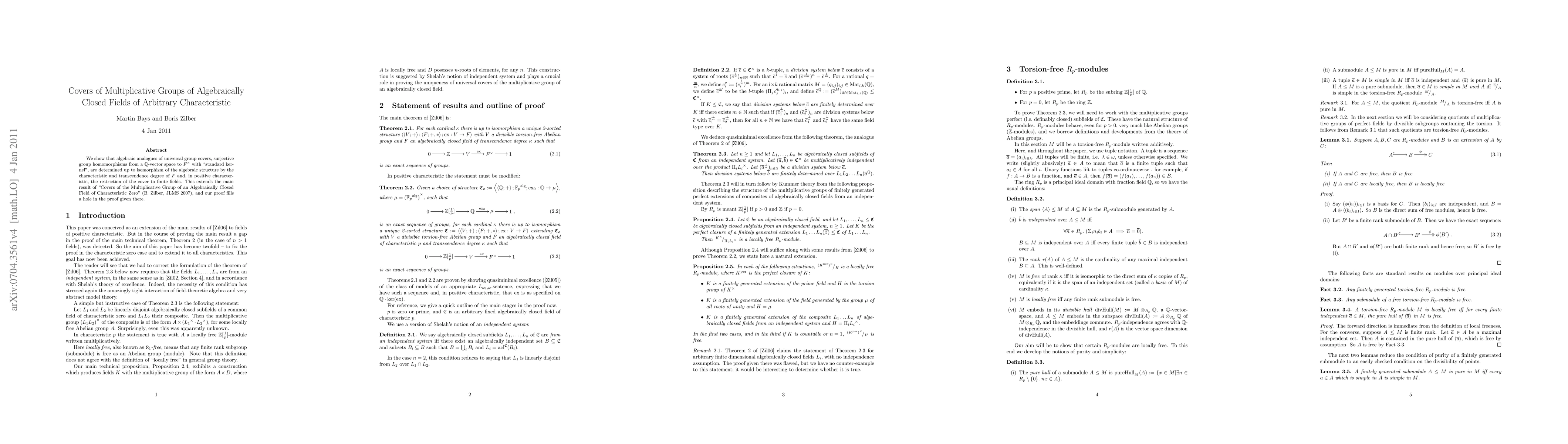 We show that algebraic analogues of universal group covers, surjective group homomorphisms from a $\mathbb{Q}$-vector space to $F^{\times}$ with "standard kernel", are determined up to isomorphism of the algebraic structure by the characteristic and transcendence degree of $F$ and, in positive characteristic, the restriction of the cover to finite fields. This extends the main result of "Covers of the Multiplicative Group of an Algebraically Closed Field of Characteristic Zero" (B. Zilber, JLMS 2007), and our proof fills a hole in the proof given there.