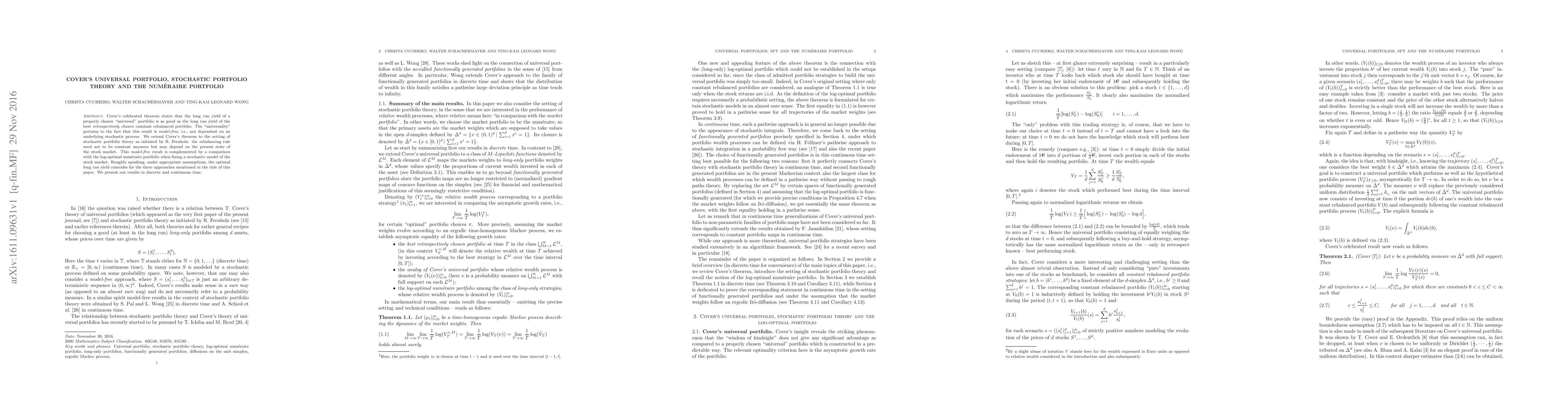 Cover's celebrated theorem states that the long run yield of a properly chosen "universal" portfolio is as good as the long run yield of the best retrospectively chosen constant rebalanced portfolio. The "universality" pertains to the fact that this result is model-free, i.e., not dependent on an underlying stochastic process. We extend Cover's theorem to the setting of stochastic portfolio theory as initiated by R. Fernholz: the rebalancing rule need not to be constant anymore but may depend on the present state of the stock market. This model-free result is complemented by a comparison with the log-optimal numeraire portfolio when fixing a stochastic model of the stock market. Roughly speaking, under appropriate assumptions, the optimal long run yield coincides for the three approaches mentioned in the title of this paper. We present our results in discrete and continuous time.