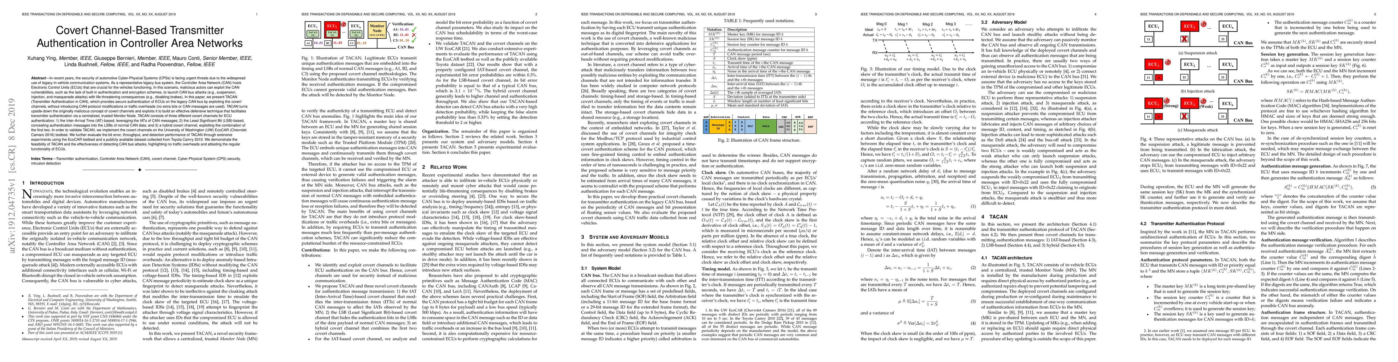 This paper introduces TACAN, a covert channel-based transmitter authentication method for Controller Area Networks (CAN) in automotive Cyber-Physical Systems, aiming to secure legacy CAN buses without protocol modifications. TACAN leverages Inter-Arrival Time and Least Significant Bit covert channels, and a hybrid approach, to authenticate Electronic Control Units via a trusted Monitor Node, validated through experiments on the EcoCAR testbed and a Toyota Camry dataset.