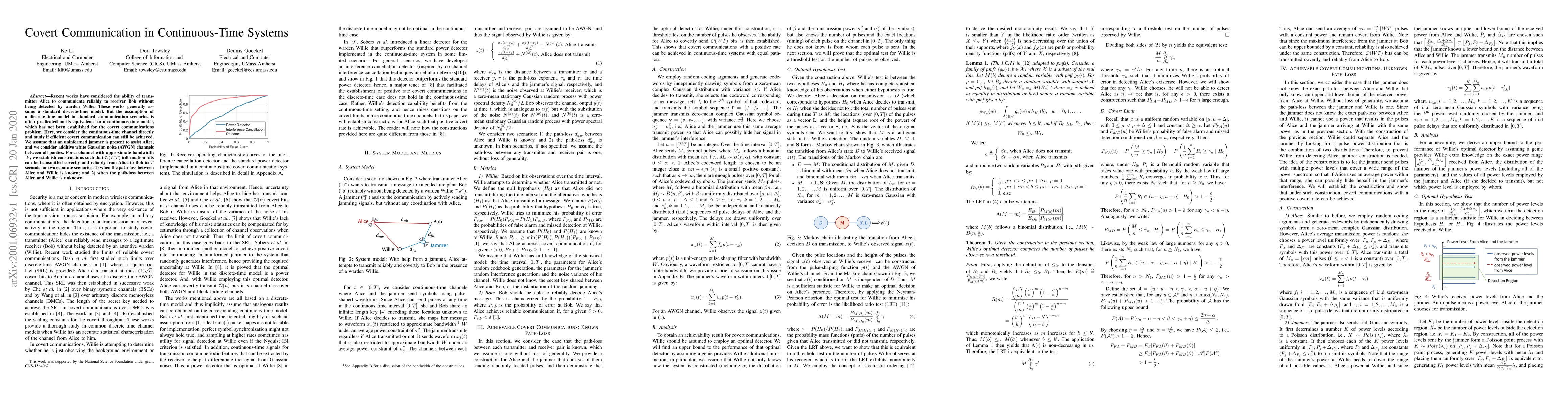 This paper investigates covert communication in continuous-time systems, finding that efficient transmission can still occur with a jammer's assistance, even without knowledge of the channel's path-loss, and achieving reliable transmission in O(WT) information bits over T seconds.