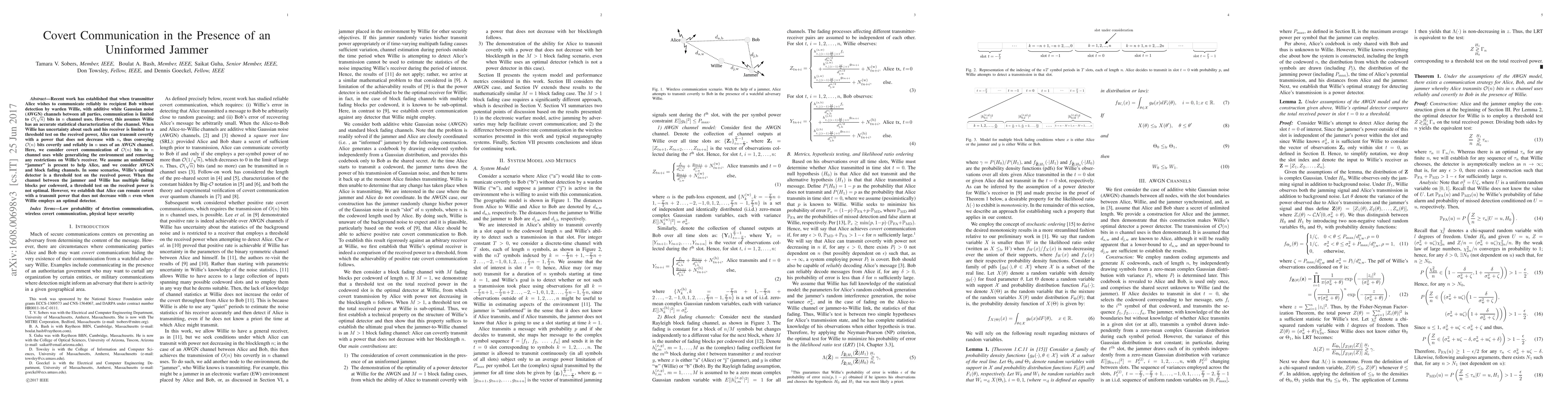 Recent work has established that when transmitter Alice wishes to communicate reliably to recipient Bob without detection by warden Willie, with additive white Gaussian noise (AWGN) channels between all parties, communication is limited to $\mathcal{O}(\sqrt{n})$ bits in $n$ channel uses. However, this assumes Willie has an accurate statistical characterization of the channel. When Willie has uncertainty about such and his receiver is limited to a threshold test on the received power, Alice can transmit covertly with a power that does not decrease with $n$, thus conveying $\mathcal{O}(n)$ bits covertly and reliably in $n$ uses of an AWGN channel. Here, we consider covert communication of $\mathcal{O}(n)$ bits in $n$ channel uses while generalizing the environment and removing any restrictions on Willie's receiver. We assume an uninformed "jammer" is present to help Alice, and we consider AWGN and block fading channels. In some scenarios, Willie's optimal detector is a threshold test on the received power. When the channel between the jammer and Willie has multiple fading blocks per codeword, a threshold test on the received power is not optimal. However, we establish that Alice can remain covert with a transmit power that does not decrease with $n$ even when Willie employs an optimal detector.