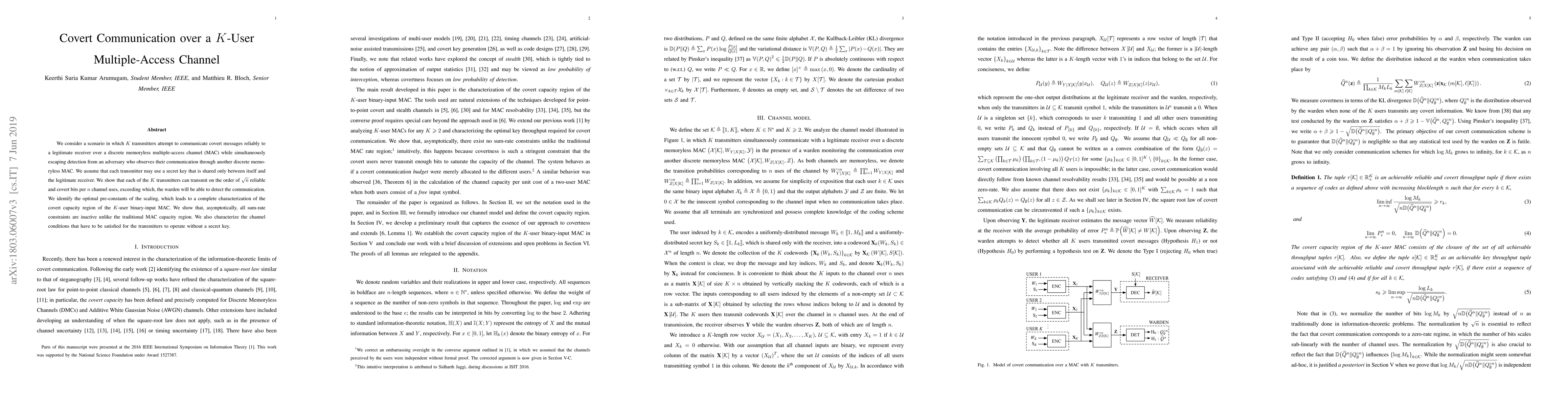 Researchers show that K transmitters can send up to sqrt(n) reliable and covert bits per n channel uses in a system with an adversary trying to detect their communication. The study characterizes the optimal pre-constants for this scenario.