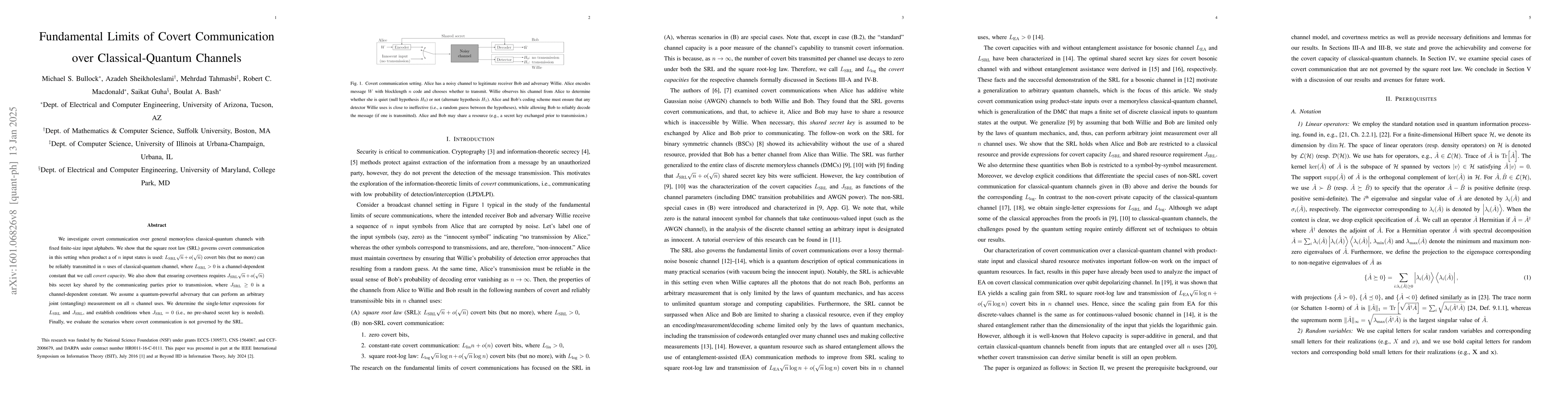 This paper explores covert communication over classical-quantum channels, demonstrating that the square root law governs covert bits transmission and secret sharing requirements. It identifies channel-dependent constants for covert capacity and pre-shared secret bits, and conditions under which no pre-shared secret is needed.