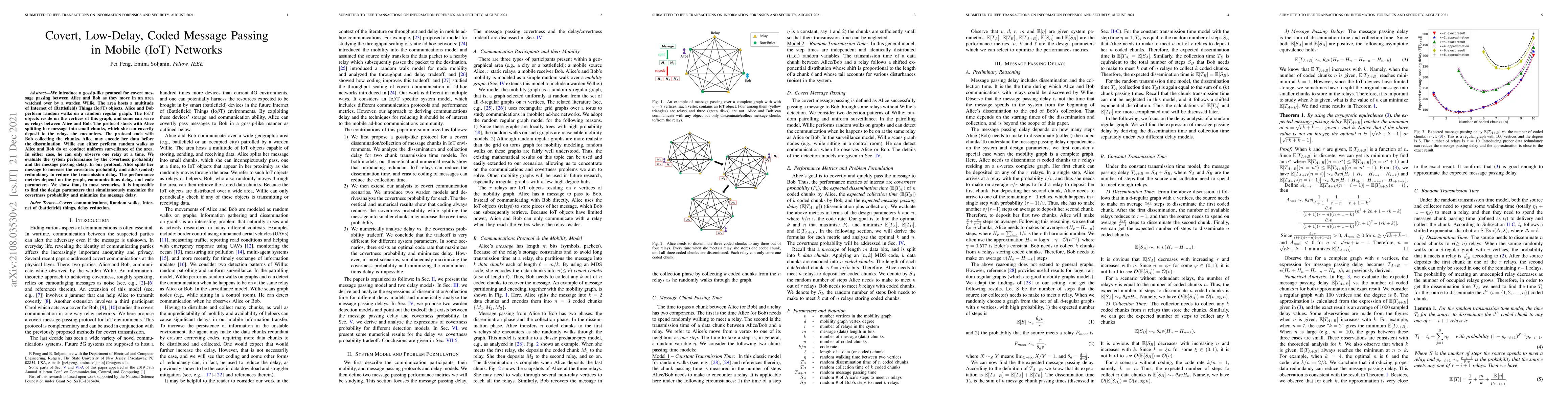 Researchers developed a protocol for covert message passing in IoT networks, allowing Alice to send secret messages to Bob while avoiding detection by Willie, the network warden, with trade-offs between covertness probability and delay.