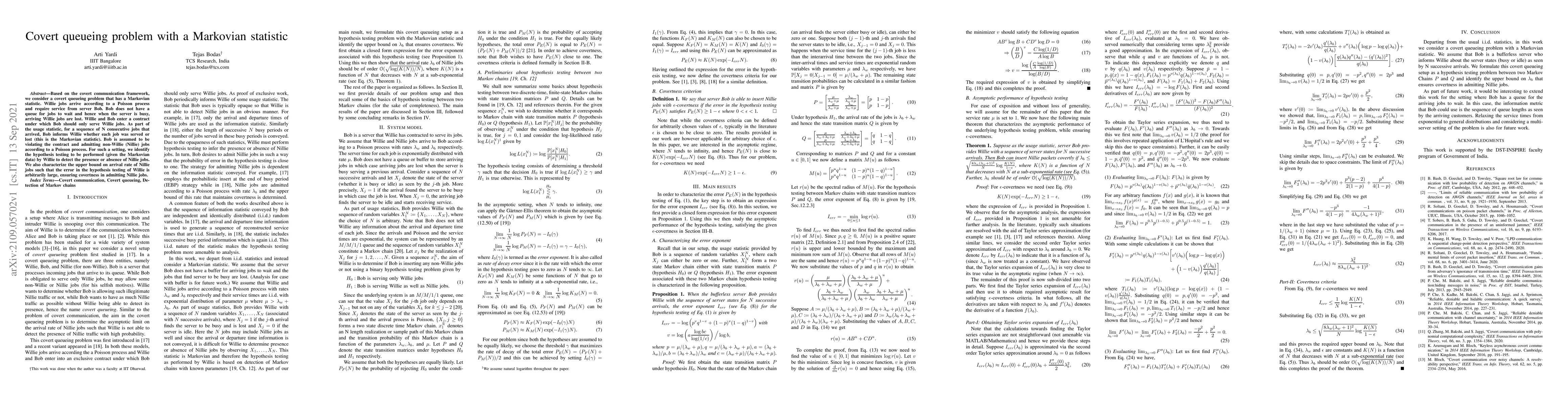 Researchers investigate how Willie detects Nillie jobs in a covert queueing problem where Bob admits non-Willie jobs. They find an upper bound on arrival rate for Nillie jobs to ensure arbitrary large error in detection.