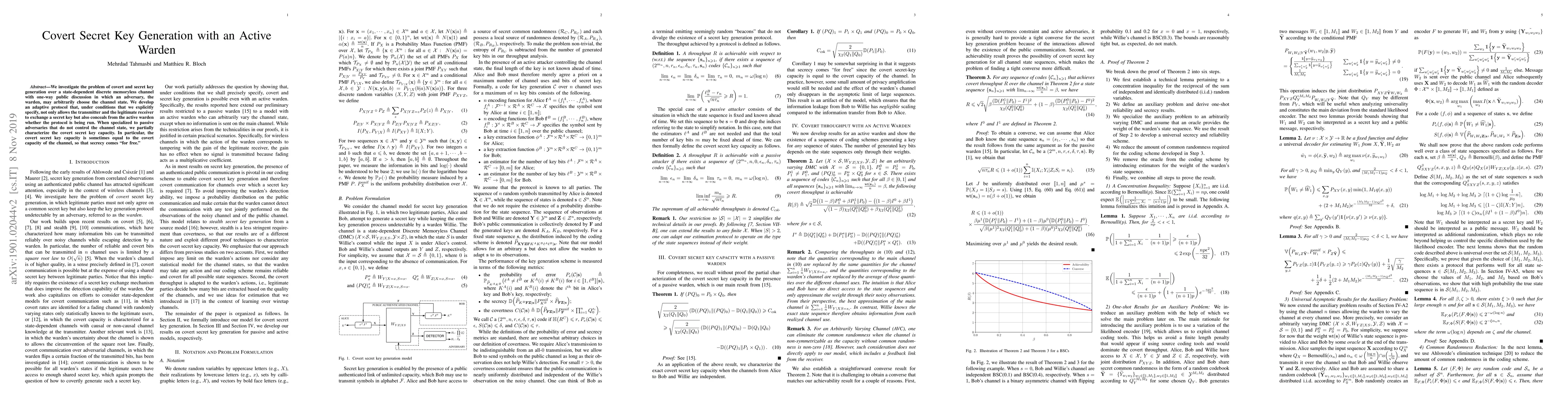 We investigate the problem of covert and secret key generation over a state-dependent discrete memoryless channel with one-way public discussion in which an adversary, the warden, may arbitrarily choose the channel state. We develop an adaptive protocol that, under conditions that we explicitly specify, not only allows the transmitter and the legitimate receiver to exchange a secret key but also conceals from the active warden whether the protocol is being run. When specialized to passive adversaries that do not control the channel state, we partially characterize the covert secret key capacity. In particular, the covert secret key capacity is sometimes equal to the covert capacity of the channel, so that secrecy comes "for free."