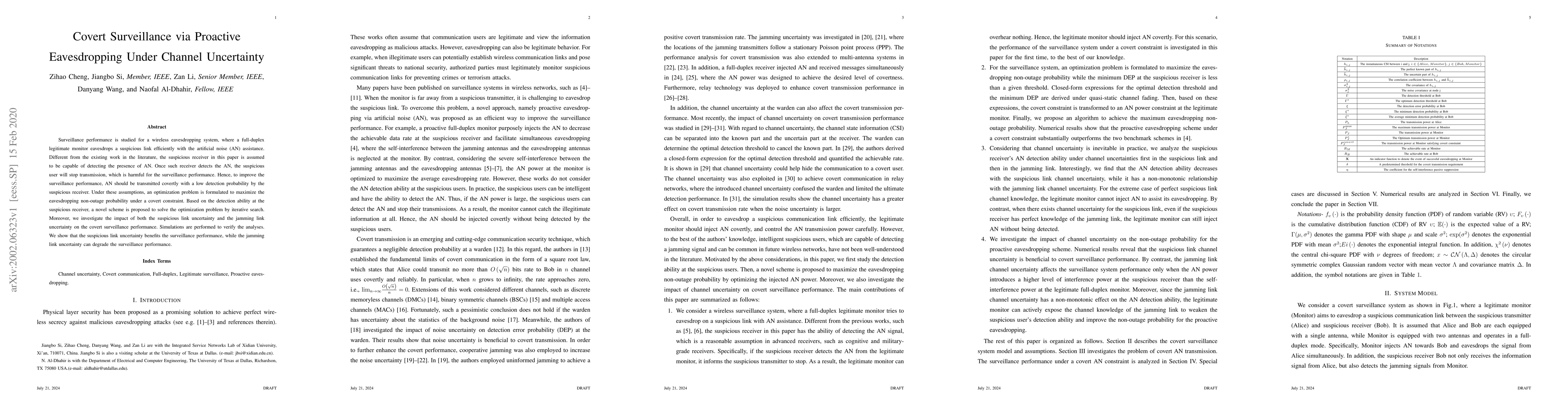 Surveillance performance is studied for a wireless eavesdropping system, where a full-duplex legitimate monitor eavesdrops a suspicious link efficiently with the artificial noise (AN) assistance. Different from the existing work in the literature, the suspicious receiver in this paper is assumed to be capable of detecting the presence of AN. Once such receiver detects the AN, the suspicious user will stop transmission, which is harmful for the surveillance performance. Hence, to improve the surveillance performance, AN should be transmitted covertly with a low detection probability by the suspicious receiver. Under these assumptions, an optimization problem is formulated to maximize the eavesdropping non-outage probability under a covert constraint. Based on the detection ability at the suspicious receiver, a novel scheme is proposed to solve the optimization problem by iterative search. Moreover, we investigate the impact of both the suspicious link uncertainty and the jamming link uncertainty on the covert surveillance performance. Simulations are performed to verify the analyses. We show that the suspicious link uncertainty benefits the surveillance performance, while the jamming link uncertainty can degrade the surveillance performance.