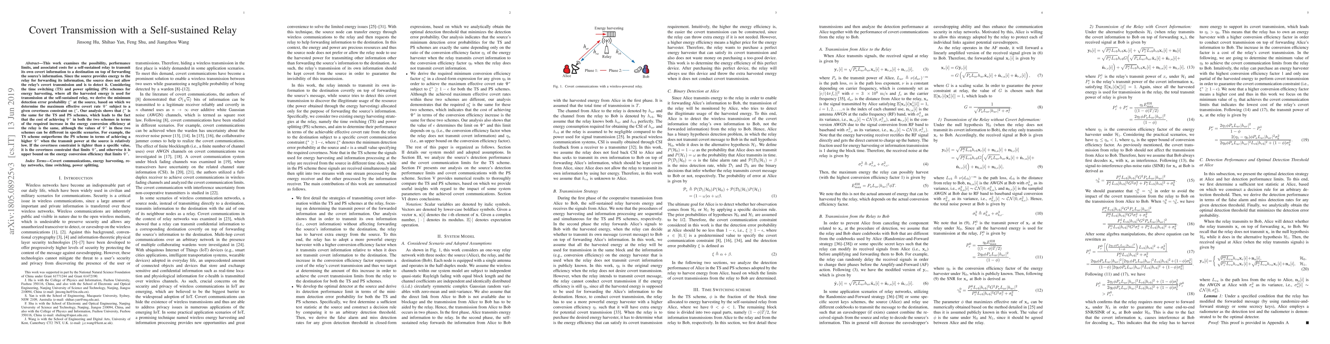 This work examines the possibility, performance limits, and associated costs for a self-sustained relay to transmit its own covert information to a destination on top of forwarding the source's information. Since the source provides energy to the relay for forwarding its information, the source does not allow the relay's covert transmission and is to detect it. Considering the time switching (TS) and power splitting (PS) schemes for energy harvesting, where all the harvested energy is used for transmission at the self-sustained relay, we derive the minimum detection error probability $\xi^{\ast}$ at the source, based on which we determine the maximum effective covert rate $\Psi^{\ast}$ subject to a given covertness constraint on $\xi^{\ast}$. Our analysis shows that $\xi^{\ast}$ is the same for the TS and PS schemes, which leads to the fact that the cost of achieving $\Psi^{\ast}$ in both the two schemes in terms of the required increase in the energy conversion efficiency at the relay is the same, although the values of $\Psi^{\ast}$ in these two schemes can be different in specific scenarios. For example, the TS scheme outperforms the PS scheme in terms of achieving a higher $\Psi^{\ast}$ when the transmit power at the source is relatively low. If the covertness constraint is tighter than a specific value, it is the covertness constraint that limits $\Psi^{\ast}$, and otherwise it is upper bound on the energy conversion efficiency that limits $\Psi^{\ast}$.
