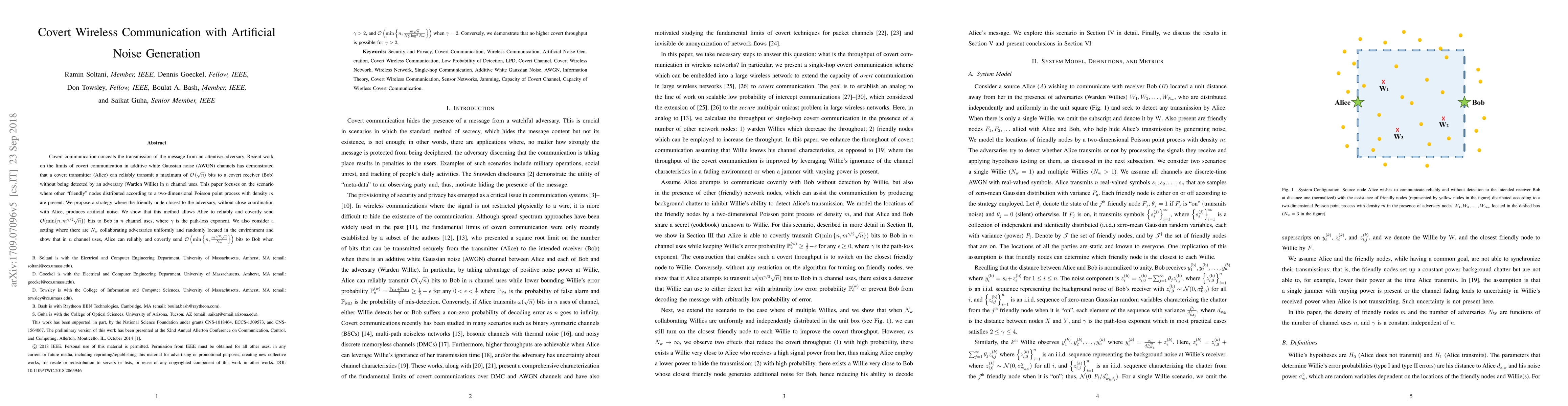 This paper explores covert wireless communication strategies using artificial noise generation to conceal message transmission from adversaries. The proposed method leverages the nearest friendly node to generate artificial noise, enabling Alice to covertly transmit $\mathcal{O}(\min\{{n,m^{\gamma/2}\sqrt{n}}\})$ bits to Bob under various adversarial settings, optimizing throughput based on path-loss exponent $\gamma$.
