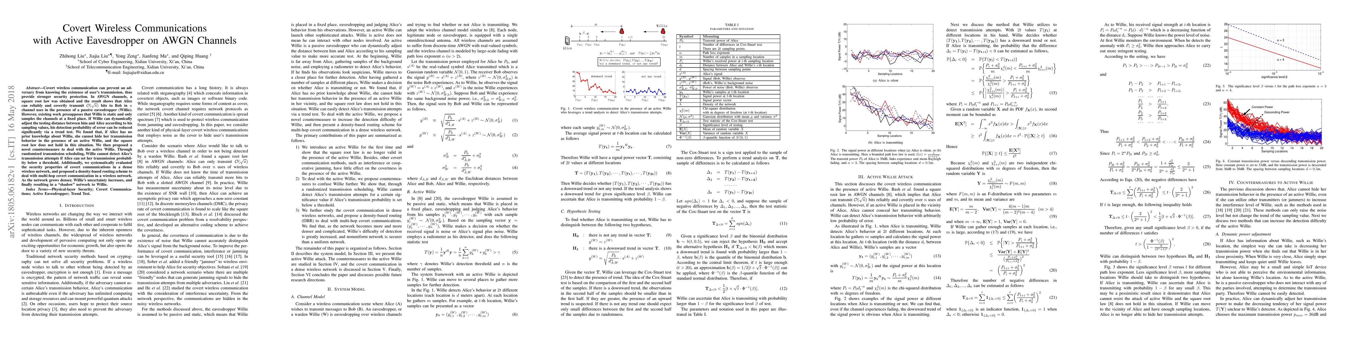 This paper investigates covert wireless communications in AWGN channels with an active eavesdropper, demonstrating that traditional square root law for covert transmission fails when the eavesdropper can dynamically adjust its position. The authors propose a randomized transmission scheduling method to maintain covertness and introduce a density-based routing scheme to enhance security in dense wireless networks.