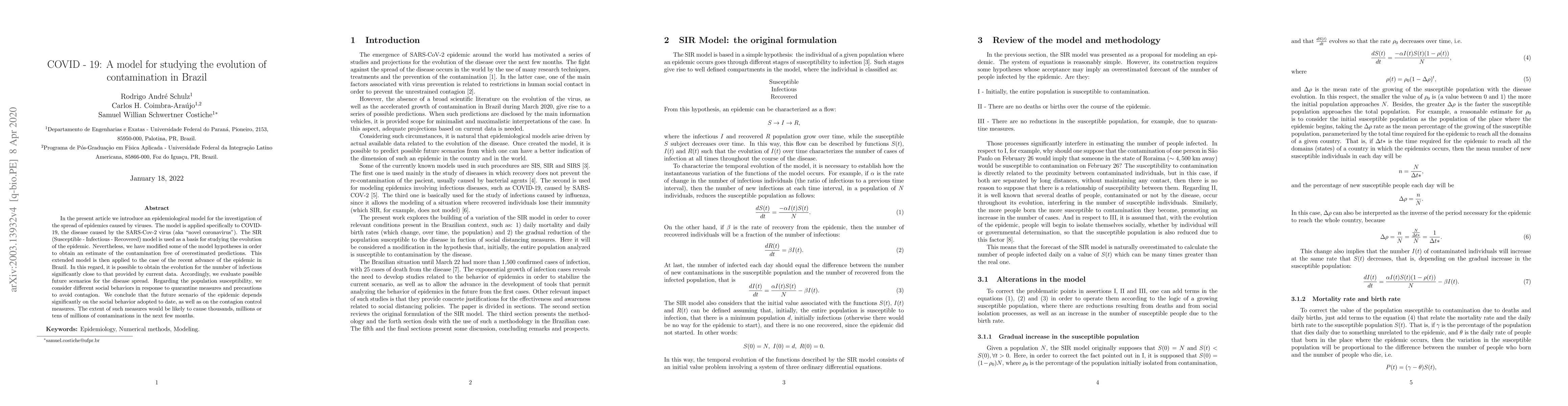 In the present article we introduce an epidemiological model for the investigation of the spread of epidemics caused by viruses. The model is applied specifically to COVID-19, the disease caused by the SARS-Cov-2 virus (aka "novel coronavirus"). The SIR (Susceptible - Infectious - Recovered) model is used as a basis for studying the evolution of the epidemic. Nevertheless, we have modified some of the model hypotheses in order to obtain an estimate of the contamination free of overestimated predictions. This extended model is then applied to the case of the recent advance of the epidemic in Brazil. In this regard, it is possible to obtain the evolution for the number of infectious significantly close to that provided by current data. Accordingly, we evaluate possible future scenarios for the disease spread. Regarding the population susceptibility, we consider different social behaviors in response to quarantine measures and precautions to avoid contagion. We conclude that the future scenario of the epidemic depends significantly on the social behavior adopted to date, as well as on the contagion control measures. The extent of such measures would be likely to cause thousands, millions or tens of millions of contaminations in the next few months.
