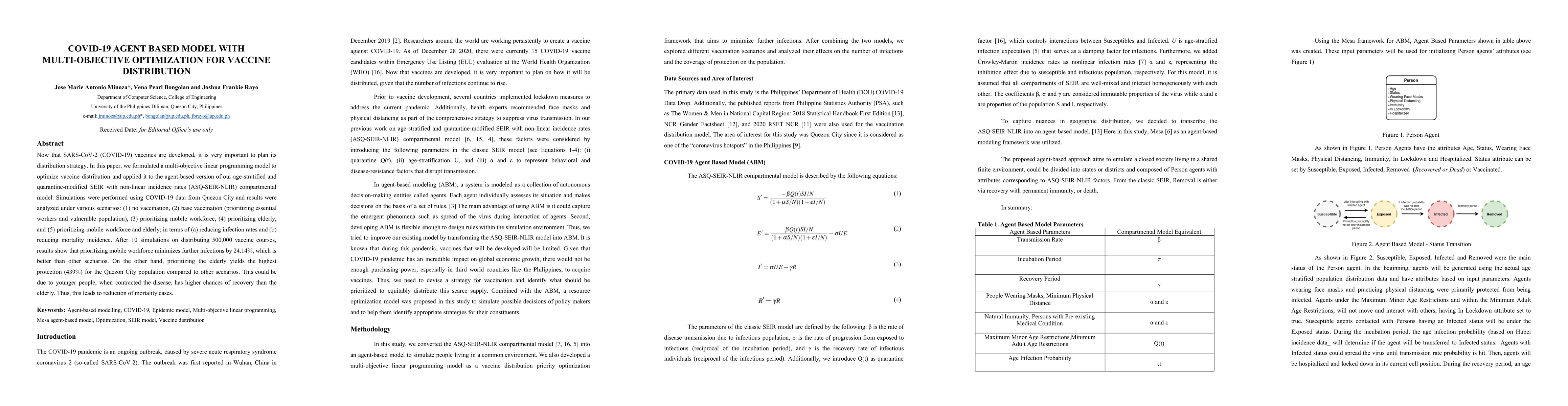 Now that SARS-CoV-2 (COVID-19) vaccines are developed, it is very important to plan its distribution strategy. In this paper, we formulated a multi-objective linear programming model to optimize vaccine distribution and applied it to the agent-based version of our age-stratified and quarantine-modified SEIR with non-linear incidence rates (ASQ-SEIR-NLIR) compartmental model. Simulations were performed using COVID-19 data from Quezon City and results were analyzed under various scenarios: (1) no vaccination, (2) base vaccination (prioritizing essential workers and vulnerable population), (3) prioritizing mobile workforce, (4) prioritizing elderly, and (5) prioritizing mobile workforce and elderly; in terms of (a) reducing infection rates and (b) reducing mortality incidence. After 10 simulations on distributing 500,000 vaccine courses, results show that prioritizing mobile workforce minimizes further infections by 24.14%, which is better than other scenarios. On the other hand, prioritizing the elderly yields the highest protection (439%) for the Quezon City population compared to other scenarios. This could be due to younger people, when contracted the disease, has higher chances of recovery than the elderly. Thus, this leads to reduction of mortality cases.