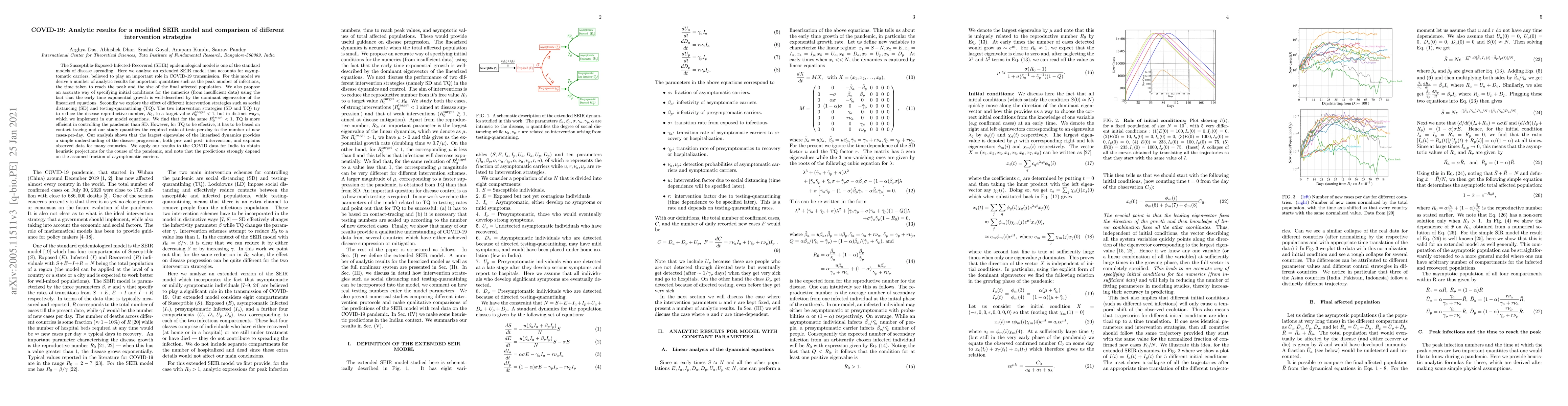 The Susceptible-Exposed-Infected-Recovered (SEIR) epidemiological model is one of the standard models of disease spreading. Here we analyse an extended SEIR model that accounts for asymptomatic carriers, believed to play an important role in COVID-19 transmission. For this model we derive a number of analytic results for important quantities such as the peak number of infections, the time taken to reach the peak and the size of the final affected population. We also propose an accurate way of specifying initial conditions for the numerics (from insufficient data) using the fact that the early time exponential growth is well-described by the dominant eigenvector of the linearized equations. Secondly we explore the effect of different intervention strategies such as social distancing (SD) and testing-quarantining (TQ). The two intervention strategies (SD and TQ) try to reduce the disease reproductive number, $R_0$, to a target value $R^{\rm target}_0 < 1$, but in distinct ways, which we implement in our model equations. We find that for the same $R^{\rm target}_0 < 1$, TQ is more efficient in controlling the pandemic than SD. However, for TQ to be effective, it has to be based on contact tracing and our study quantifies the required ratio of tests-per-day to the number of new cases-per-day. Our analysis shows that the largest eigenvalue of the linearised dynamics provides a simple understanding of the disease progression, both pre- and post- intervention, and explains observed data for many countries. We apply our results to the COVID data for India to obtain heuristic projections for the course of the pandemic, and note that the predictions strongly depend on the assumed fraction of asymptomatic carriers.