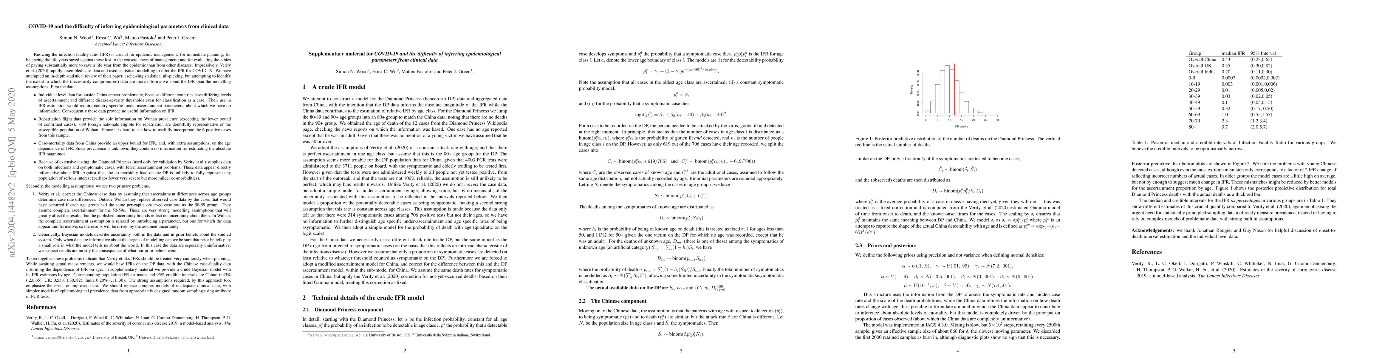 Knowing the infection fatality ratio (IFR) is of crucial importance for evidence-based epidemic management: for immediate planning; for balancing the life years saved against the life years lost due to the consequences of management; and for evaluating the ethical issues associated with the tacit willingness to pay substantially more for life years lost to the epidemic, than for those to other diseases. Against this background Verity et al. (2020, Lancet Infections Diseases) have rapidly assembled case data and used statistical modelling to infer the IFR for COVID-19. We have attempted an in-depth statistical review of their approach, to identify to what extent the data are sufficiently informative about the IFR to play a greater role than the modelling assumptions, and have tried to identify those assumptions that appear to play a key role. Given the difficulties with other data sources, we provide a crude alternative analysis based on the Diamond Princess Cruise ship data and case data from China, and argue that, given the data problems, modelling of clinical data to obtain the IFR can only be a stop-gap measure. What is needed is near direct measurement of epidemic size by PCR and/or antibody testing of random samples of the at risk population.