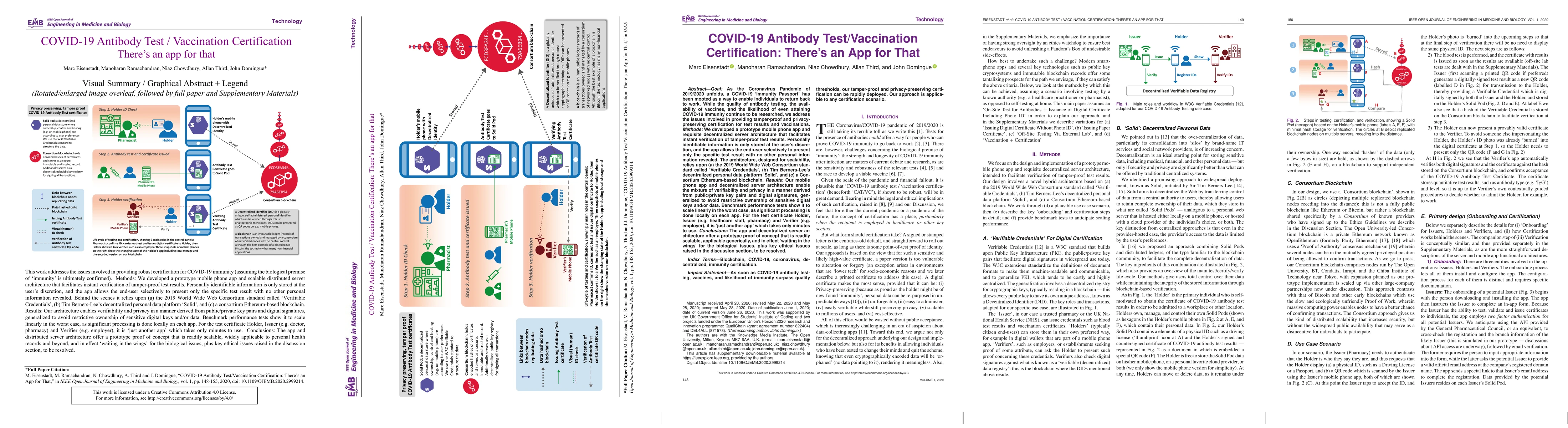 Goal: As the Coronavirus Pandemic of 2019/2020 unfolds, a COVID-19 'Immunity Passport' has been mooted as a way to enable individuals to return back to work. While the quality of antibody testing, the availability of vaccines, and the likelihood of even attaining COVID-19 immunity continue to be researched, we address the issues involved in providing tamper-proof and privacy-preserving certification for test results and vaccinations. Methods: We developed a prototype mobile phone app and requisite decentralized server architecture that facilitates instant verification of tamper-proof test results. Personally identifiable information is only stored at the user's discretion, and the app allows the end-user selectively to present only the specific test result with no other personal information revealed. The architecture, designed for scalability, relies upon (a) the 2019 World Wide Web Consortium standard called 'Verifiable Credentials', (b) Tim Berners-Lee's decentralized personal data platform 'Solid', and (c) a Consortium Ethereum-based blockchain. Results: Our mobile phone app and decentralized server architecture enable the mixture of verifiability and privacy in a manner derived from public/private key pairs and digital signatures, generalized to avoid restrictive ownership of sensitive digital keys and/or data. Benchmark performance tests show it to scale linearly in the worst case, as significant processing is done locally on each app. For the test certificate Holder, Issuer (e.g. healthcare staff, pharmacy) and Verifier (e.g. employer), it is 'just another app' which takes only minutes to use. Conclusions: The app and decentralized server architecture offer a prototype proof of concept that is readily scalable, applicable generically, and in effect 'waiting in the wings' for the biological issues, plus key ethical issues raised in the discussion section, to be resolved.