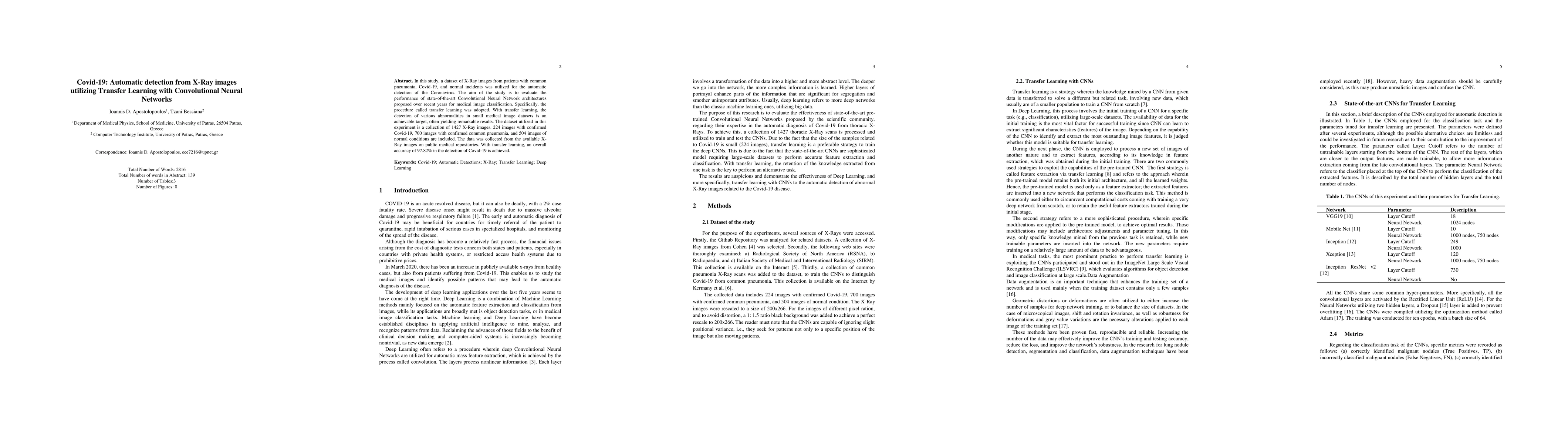 In this study, a dataset of X-Ray images from patients with common pneumonia, Covid-19, and normal incidents was utilized for the automatic detection of the Coronavirus. The aim of the study is to evaluate the performance of state-of-the-art Convolutional Neural Network architectures proposed over recent years for medical image classification. Specifically, the procedure called transfer learning was adopted. With transfer learning, the detection of various abnormalities in small medical image datasets is an achievable target, often yielding remarkable results. The dataset utilized in this experiment is a collection of 1427 X-Ray images. 224 images with confirmed Covid-19, 700 images with confirmed common pneumonia, and 504 images of normal conditions are included. The data was collected from the available X-Ray images on public medical repositories. With transfer learning, an overall accuracy of 97.82% in the detection of Covid-19 is achieved.