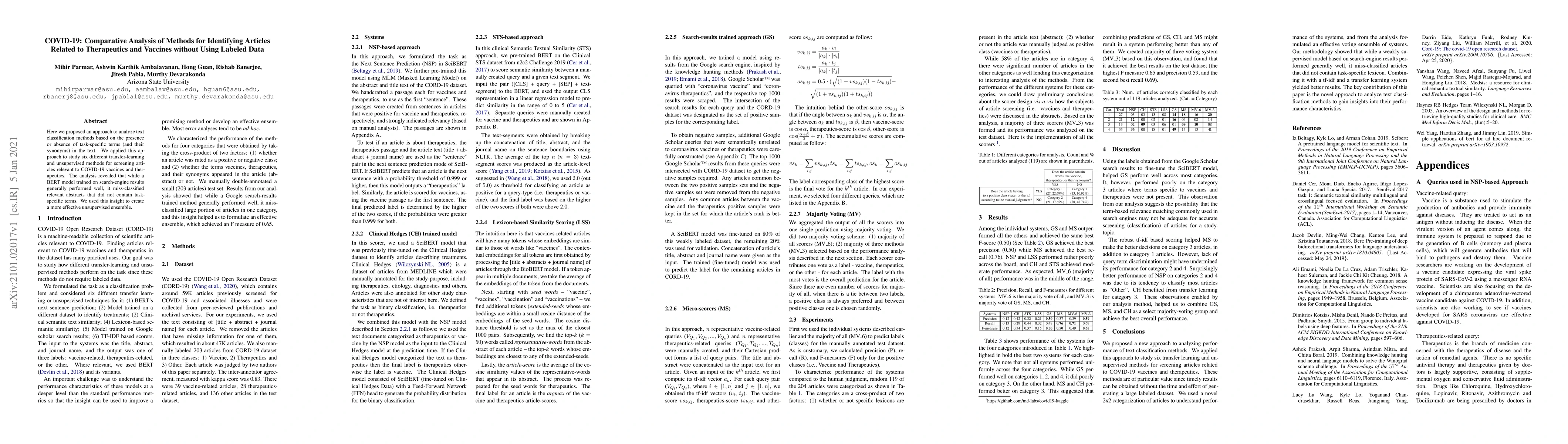 This paper proposes a text classification method using task-specific terms to identify COVID-19 therapeutic and vaccine-related articles. An analysis of six methods, including a BERT model, found that while effective, it missed abstracts lacking specific terms, leading to the development of an improved unsupervised ensemble.