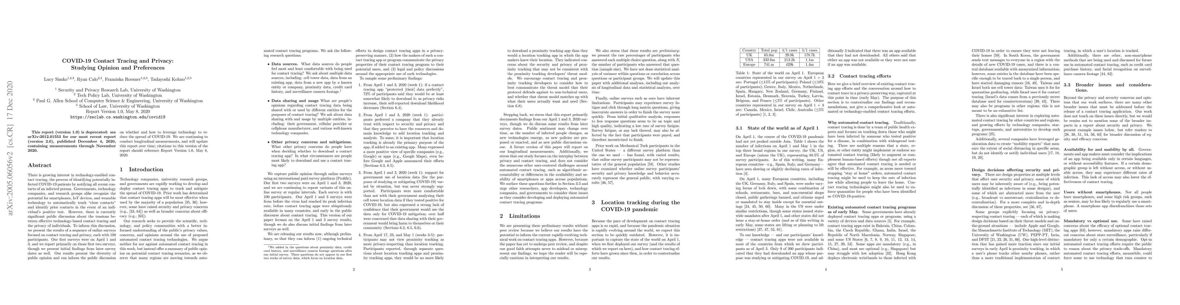 There is growing interest in technology-enabled contact tracing, the process of identifying potentially infected COVID-19 patients by notifying all recent contacts of an infected person. Governments, technology companies, and research groups alike recognize the potential for smartphones, IoT devices, and wearable technology to automatically track "close contacts" and identify prior contacts in the event of an individual's positive test. However, there is currently significant public discussion about the tensions between effective technology-based contact tracing and the privacy of individuals. To inform this discussion, we present the results of a sequence of online surveys focused on contact tracing and privacy, each with 100 participants. Our first surveys were on April 1 and 3, and we report primarily on those first two surveys, though we present initial findings from later survey dates as well. Our results present the diversity of public opinion and can inform the public discussion on whether and how to leverage technology to reduce the spread of COVID-19. We are continuing to conduct longitudinal measurements, and will update this report over time; citations to this version of the report should reference Report Version 1.0, May 8, 2020. NOTE: As of December 4, 2020, this report has been superseded by Report Version 2.0, found at arXiv:2012.01553. Please read and cite Report Version 2.0 instead.