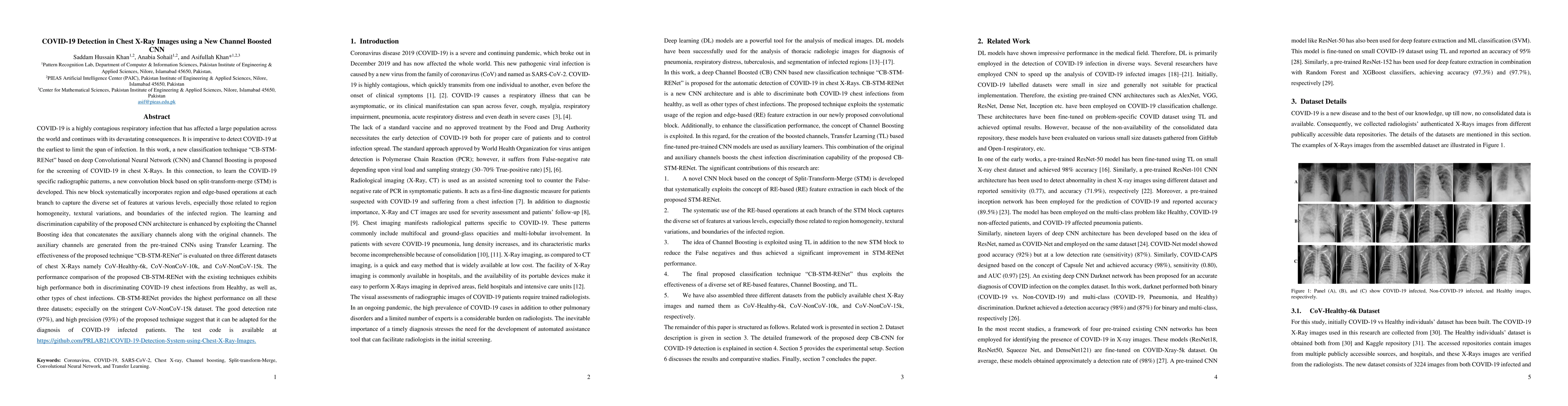 This paper proposes a new deep CNN architecture called CB-STM-RENet for detecting COVID-19 in chest X-rays, utilizing Channel Boosting and a novel split-transform-merge convolution block. The method shows high performance and accuracy in distinguishing COVID-19 infections from healthy and other chest infections across multiple datasets.