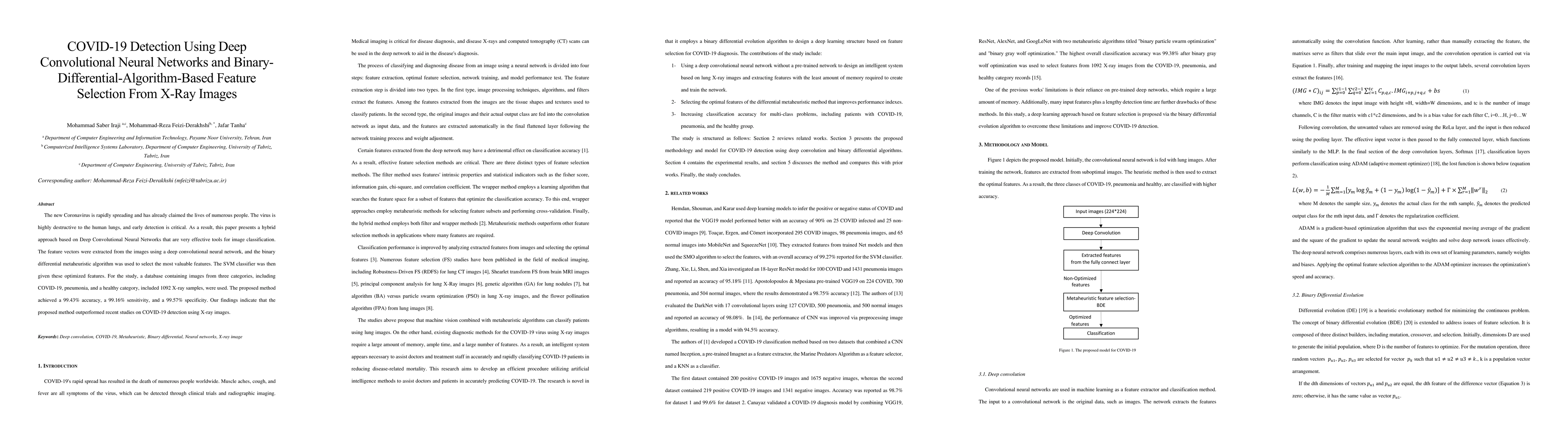 The new Coronavirus is spreading rapidly, and it has taken the lives of many people so far. The virus has destructive effects on the human lung, and early detection is very important. Deep Convolution neural networks are such powerful tools in classifying images. Therefore, in this paper, a hybrid approach based on a deep network is presented. Feature vectors were extracted by applying a deep convolution neural network on the images, and useful features were selected by the binary differential meta-heuristic algorithm. These optimized features were given to the SVM classifier. A database consisting of three categories of images such as COVID-19, pneumonia, and healthy included in 1092 X-ray samples was considered. The proposed method achieved an accuracy of 99.43%, a sensitivity of 99.16%, and a specificity of 99.57%. Our results demonstrate that the suggested approach is better than recent studies on COVID-19 detection with X-ray images.