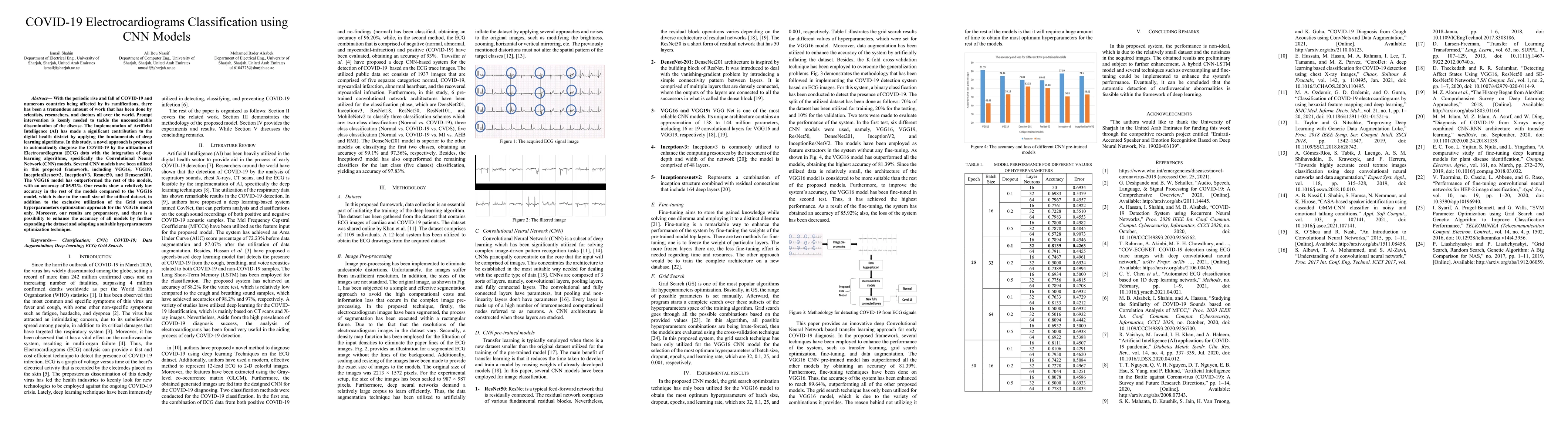 With the periodic rise and fall of COVID-19 and numerous countries being affected by its ramifications, there has been a tremendous amount of work that has been done by scientists, researchers, and doctors all over the world. Prompt intervention is keenly needed to tackle the unconscionable dissemination of the disease. The implementation of Artificial Intelligence (AI) has made a significant contribution to the digital health district by applying the fundamentals of deep learning algorithms. In this study, a novel approach is proposed to automatically diagnose the COVID-19 by the utilization of Electrocardiogram (ECG) data with the integration of deep learning algorithms, specifically the Convolutional Neural Network (CNN) models. Several CNN models have been utilized in this proposed framework, including VGG16, VGG19, InceptionResnetv2, InceptionV3, Resnet50, and Densenet201. The VGG16 model has outperformed the rest of the models, with an accuracy of 85.92%. Our results show a relatively low accuracy in the rest of the models compared to the VGG16 model, which is due to the small size of the utilized dataset, in addition to the exclusive utilization of the Grid search hyperparameters optimization approach for the VGG16 model only. Moreover, our results are preparatory, and there is a possibility to enhance the accuracy of all models by further expanding the dataset and adapting a suitable hyperparameters optimization technique.