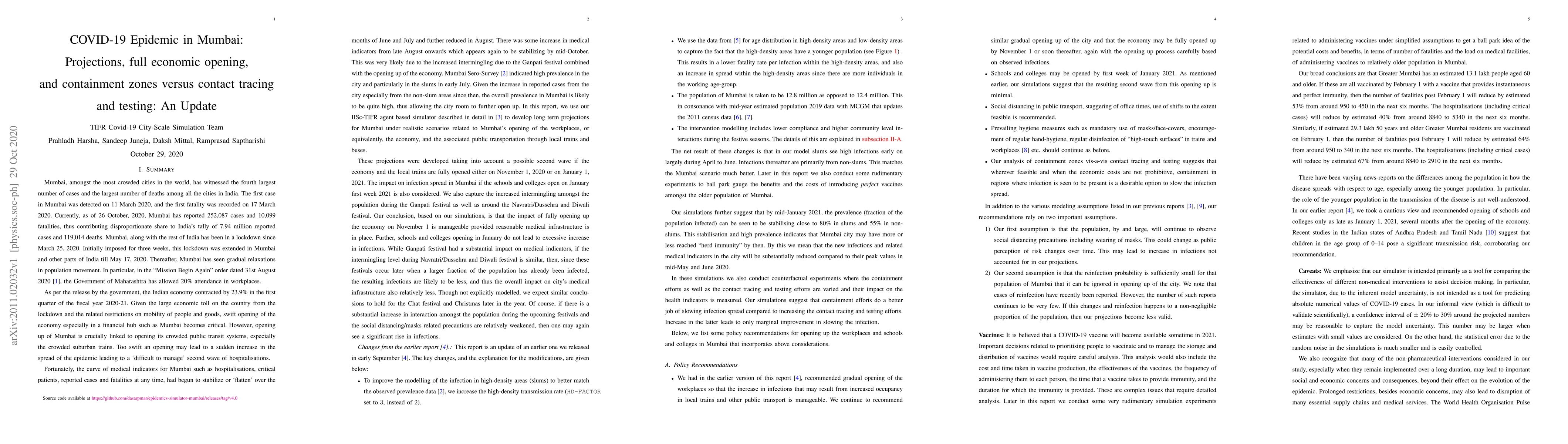 Mumbai, amongst the most densely populated cities in the world, has witnessed the fourth largest number of cases and the largest number of deaths among all the cities in India (as of 28th October 2020). Along with the rest of India, lockdowns (of varying degrees) have been in effect in Mumbai since March 25, 2020. Given the large economic toll on the country from the lockdown and the related restrictions on mobility of people and goods, swift opening of the economy especially in a financial hub such as Mumbai becomes critical. In this report, we use the IISc-TIFR agent based simulator to develop long term projections for Mumbai under realistic scenarios related to Mumbai's opening of the workplaces, or equivalently, the economy, and the associated public transportation through local trains and buses. These projections were developed taking into account a possible second wave if the economy and the local trains are fully opened either on November 1, 2020 or on January 1, 2021. The impact on infection spread in Mumbai if the schools and colleges open on January first week 2021 is also considered. We also try to account for the increased intermingling amongst the population during the Ganeshotsav festival as well as around the Navratri/Dussehra and Diwali festival. Our conclusion, based on our simulations, is that the impact of fully opening up the economy on November 1 is manageable provided reasonable medical infrastructure is in place. Further, schools and colleges opening in January do not lead to excessive increase in infections. The report also explores the relative effectiveness of contact tracing vs containment zones, and also includes very rudimentary results of the effect of vaccinating the elderly population in February 2021.