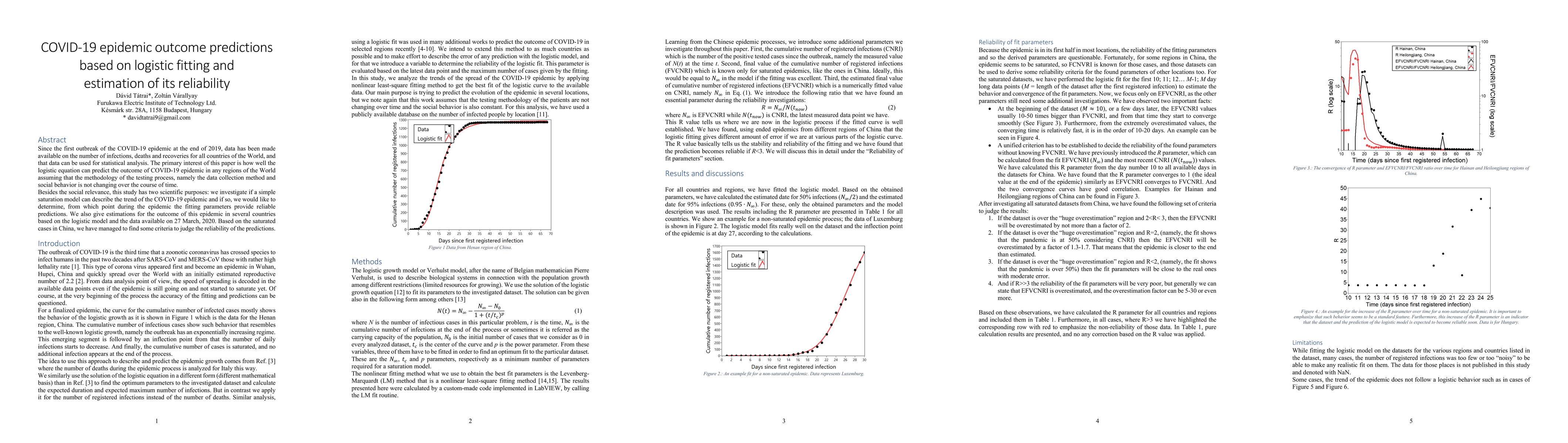 Since the first outbreak of the COVID-19 epidemic at the end of 2019, data has been made available on the number of infections, deaths and recoveries for all countries of the World, and that data can be used for statistical analysis. The primary interest of this paper is how well the logistic equation can predict the outcome of COVID-19 epidemic in any regions of the World assuming that the methodology of the testing process, namely the data collection method and social behavior is not changing over the course of time. Besides the social relevance, this study has two scientific purposes: we investigate if a simple saturation model can describe the trend of the COVID-19 epidemic and if so, we would like to determine, from which point during the epidemic the fitting parameters provide reliable predictions. We also give estimations for the outcome of this epidemic in several countries based on the logistic model and the data available on 27 March, 2020. Based on the saturated cases in China, we have managed to find some criteria to judge the reliability of the predictions.