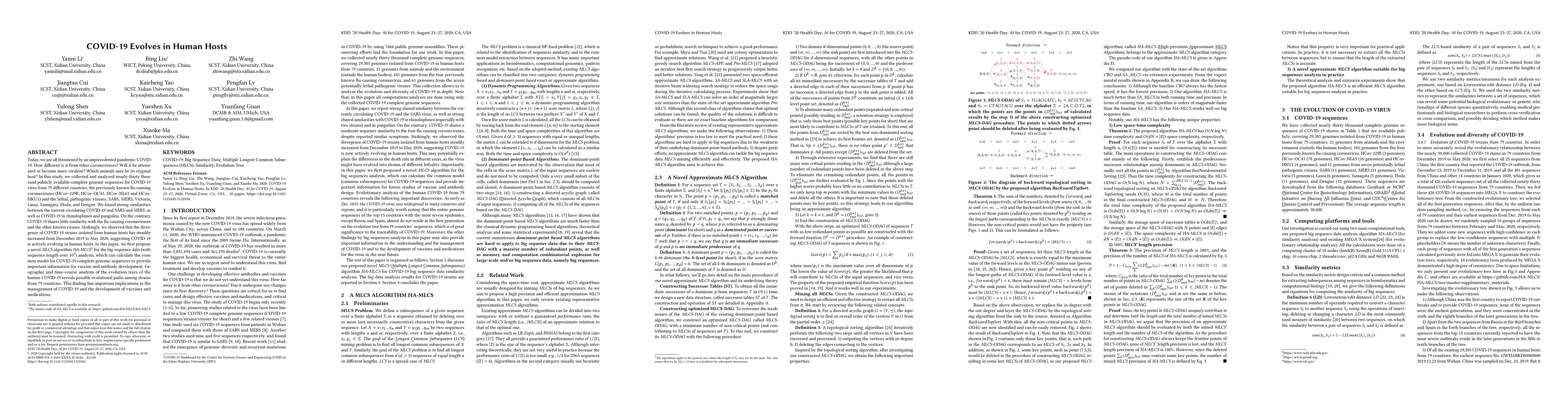 Today, we are all threatened by an unprecedented pandemic: COVID-19. How different is it from other coronaviruses? Will it be attenuated or become more virulent? Which animals may be its original host? In this study, we collected and analyzed nearly thirty thousand publicly available complete genome sequences for COVID-19 virus from 79 different countries, the previously known flu-causing coronaviruses (HCov-229E, HCov-OC43, HCov-NL63 and HCov-HKU1) and the lethal, pathogenic viruses, SARS, MERS, Victoria, Lassa, Yamagata, Ebola, and Dengue. We found strong similarities between the current circulating COVID-19 and SARS and MERS, as well as COVID-19 in rhinolophines and pangolins. On the contrary, COVID-19 shares little similarity with the flu-causing coronaviruses and the other known viruses. Strikingly, we observed that the divergence of COVID-19 strains isolated from human hosts has steadily increased from December 2019 to May 2020, suggesting COVID-19 is actively evolving in human hosts. In this paper, we first propose a novel MLCS algorithm NP-MLCS1 for the big sequence analysis, which can calculate the common model for COVID-19 complete genome sequences to provide important information for vaccine and antibody development. Geographic and time-course analysis of the evolution trees of the human COVID-19 reveals possible evolutional paths among strains from 79 countries. This finding has important implications to the management of COVID-19 and the development of vaccines and medications.